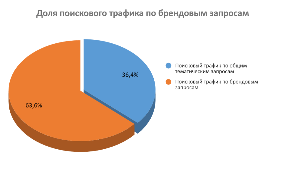 При том, что доля поискового трафика по брендовым запросам (включающим название компании) составляет 63,6%, а поисковый трафик по общим тематическим запросам — всего 36,4%.