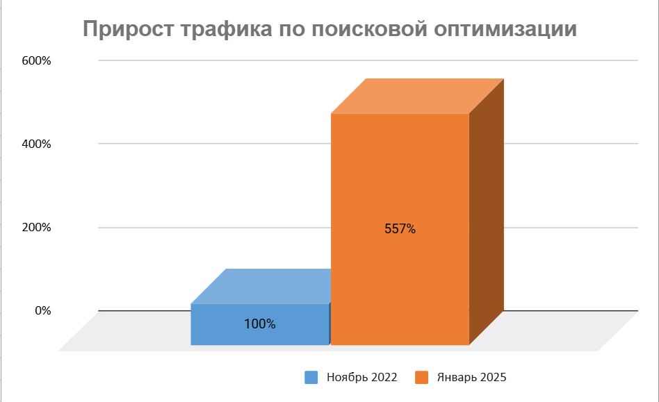 ✅ Команде Пиксель Плюс удалось поднять посещаемость не в 2, а в 5,5 раз. Трафик из поисковых систем за два года работ (с ноября 2022 года по январь 2025 года) вырос в 5.5 раз или на 457% без брендовых запросов.