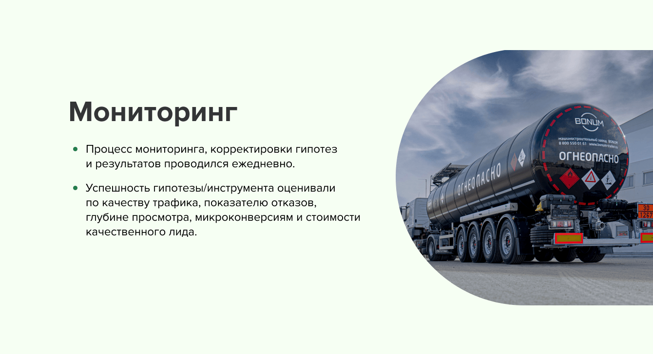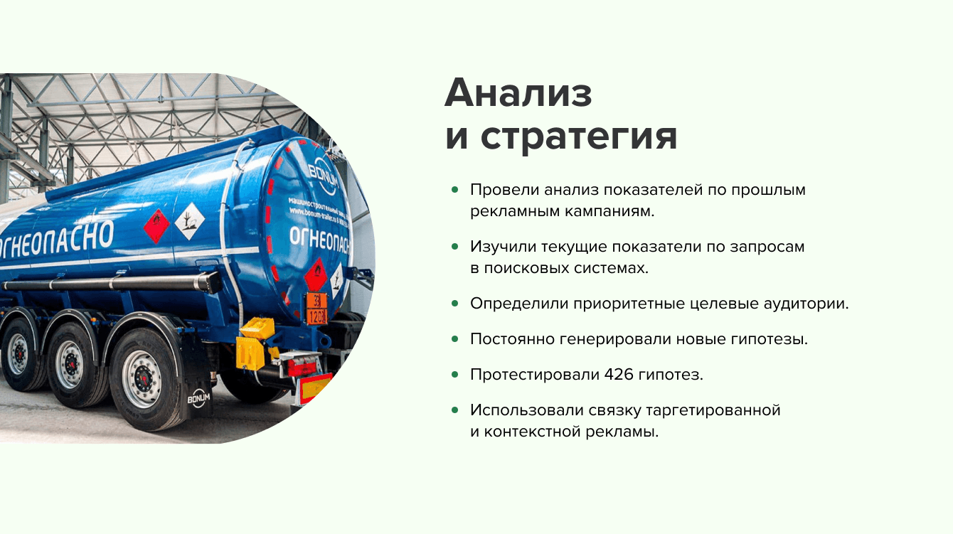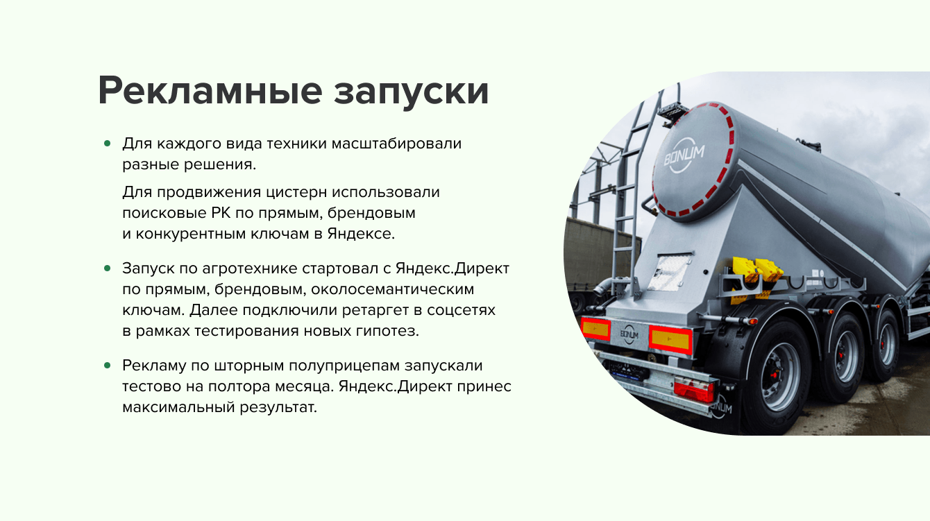 На старте провели анализ показателей по прошлым рекламным кампаниям в разрезе количества и стоимости качественных лидов. Изучили текущие показатели по запросам в поисковых системах, определили приоритетные целевые аудитории для тех видов техники, которые были заявлены заказчиком для продвижения: цистерны, агротехника и шторные полуприцепы.