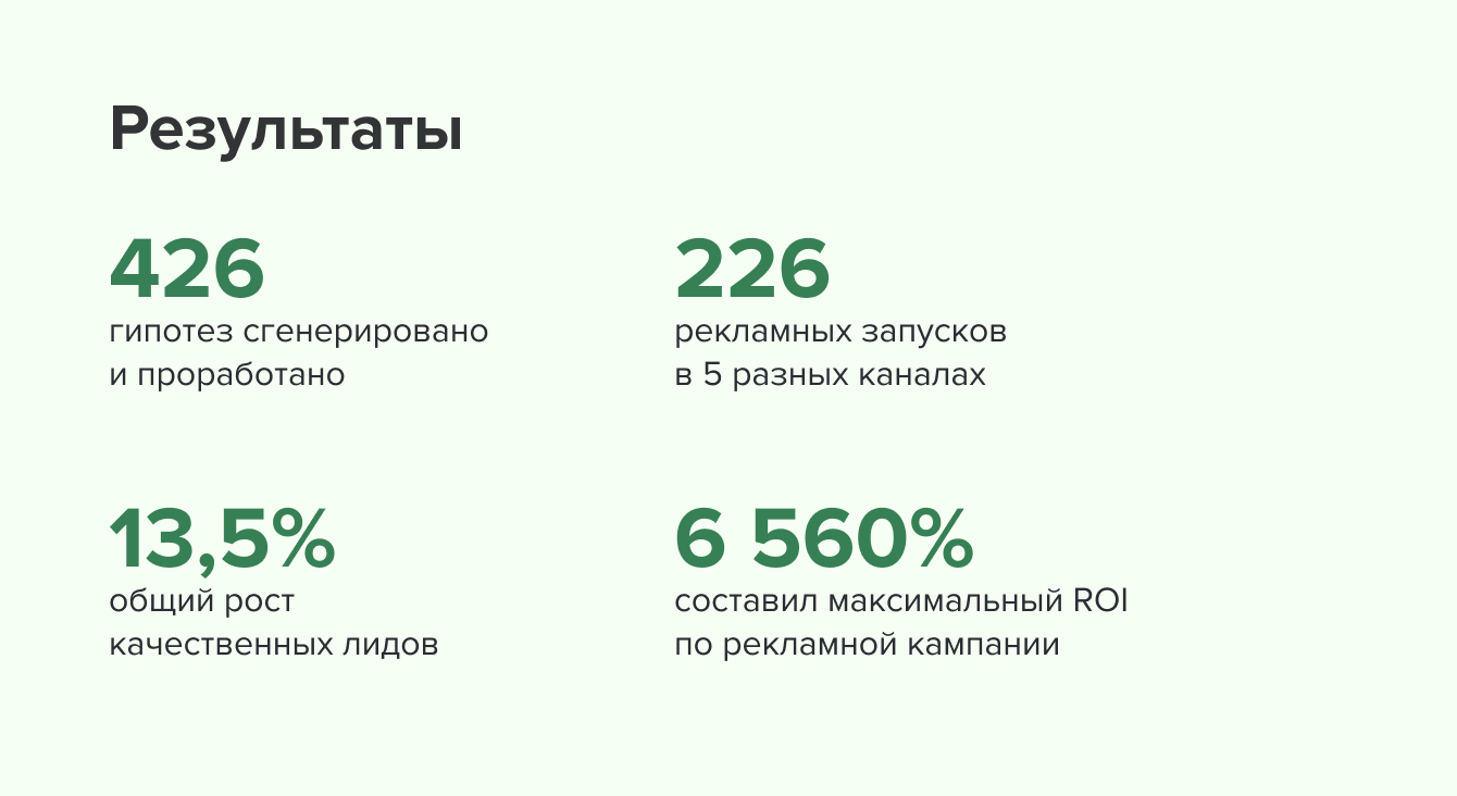 Из-за сложности ниши мы постоянно генерировали новые гипотезы и тестировали их. За весь период рекламной кампании наша команда протестировала 426 гипотез, на проработку которых ушло более 500 часов.