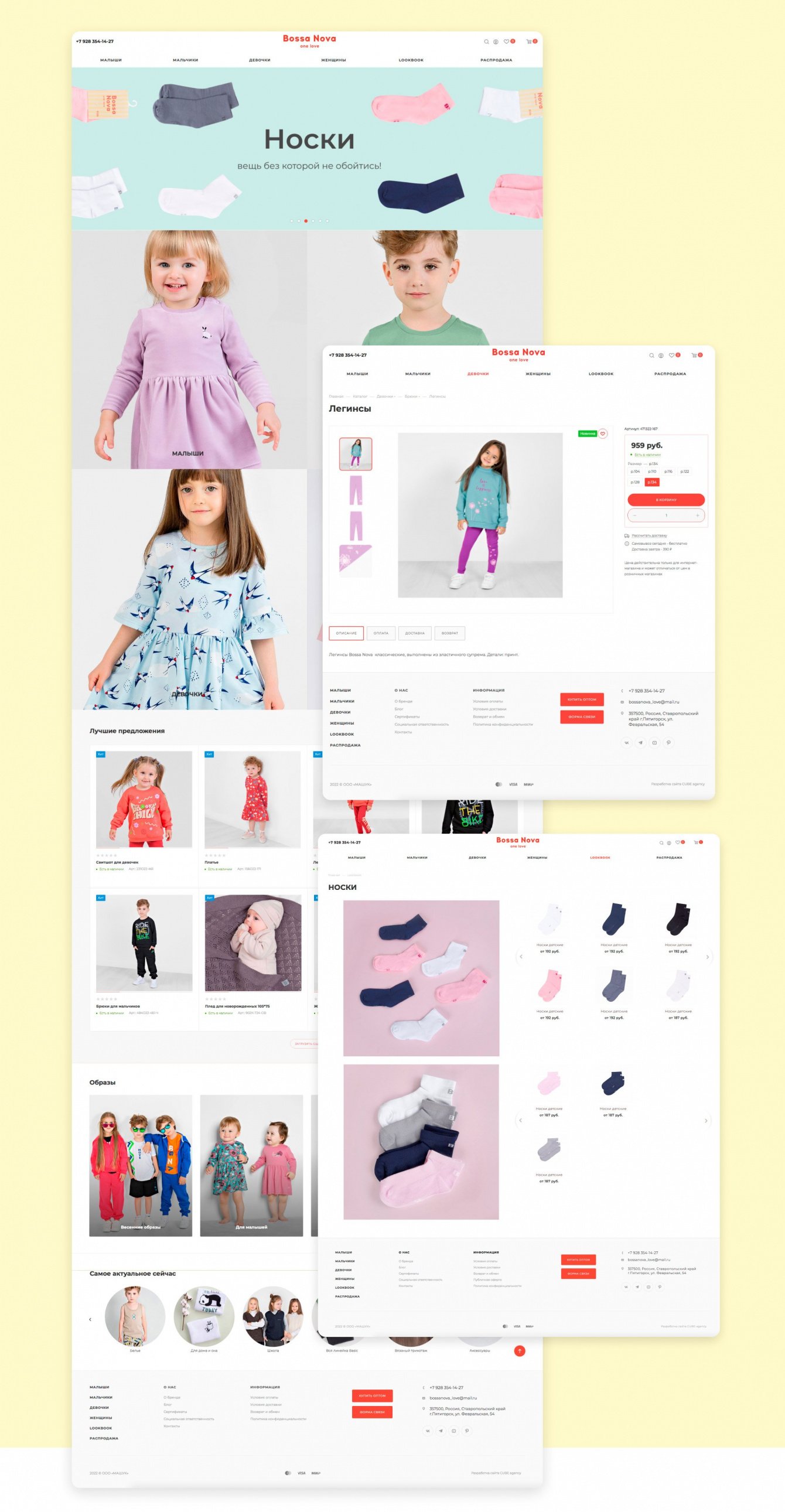 После доработок, дизайн сайта получился очень чистым и стильным. Этому способствовали и профессиональные фотографии товара, которые бренд Bossa Nova создает в своей фотостудии с участием маленьких моделей.