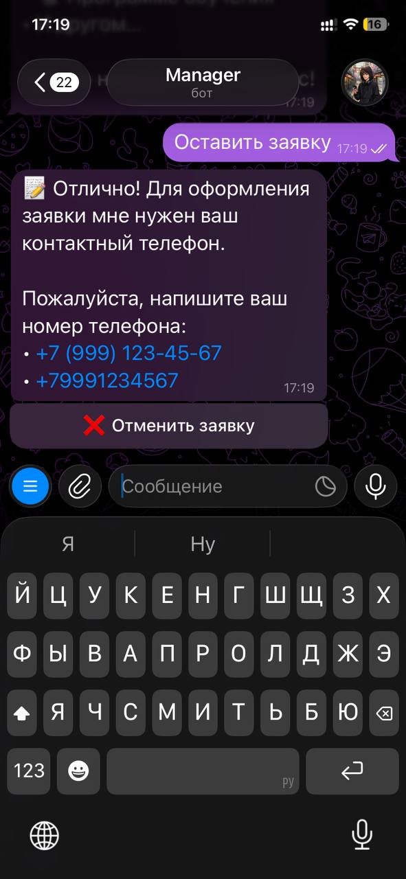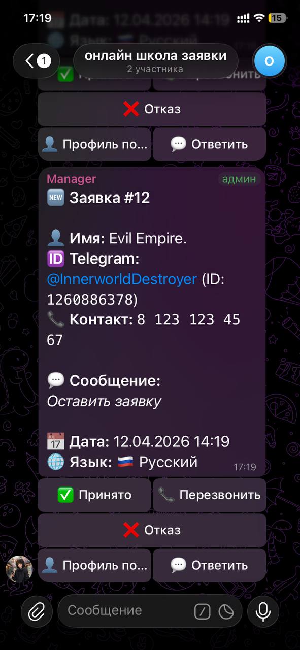 Настроили сбор контактов и создание заявок. Когда клиент хочет записаться, бот просит телефон или email. Менеджер получает уведомление в Telegram с полной информацией: имя, контакт, вопрос клиента.Менеджер управляет заявками кнопками: принять, перезвонить, отклонить, ответить клиенту.