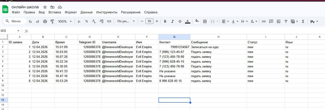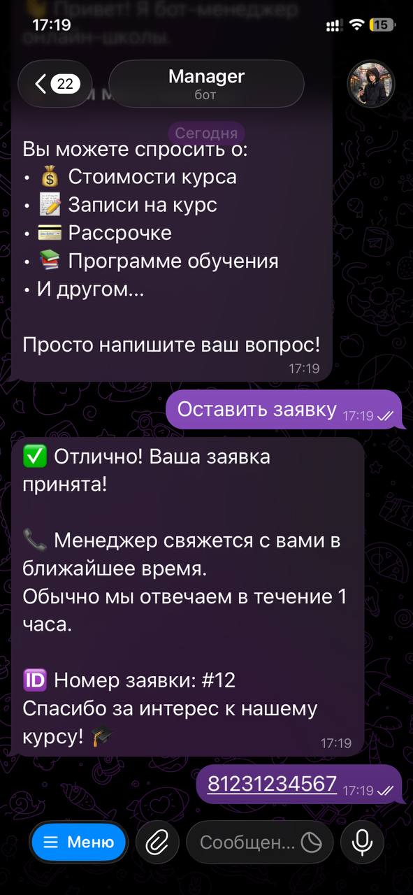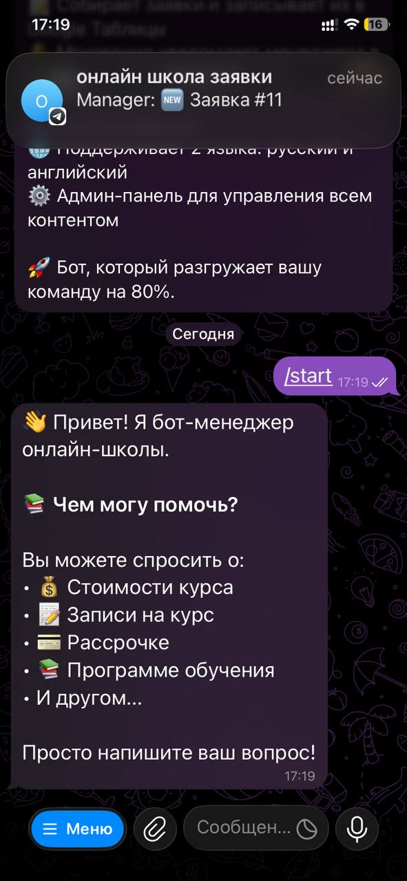 нлайн школе нужен был бот, который автоматически отвечает на вопросы учеников, собирает заявки и передаёт их менеджеру. До бота менеджеры тратили время на однотипные ответы, клиенты ждали подолгу, заявки терялись в переписке.Цель: разгрузить менеджера на 80 процентов, отвечать за 1 секунду, не терять ни одного клиента.