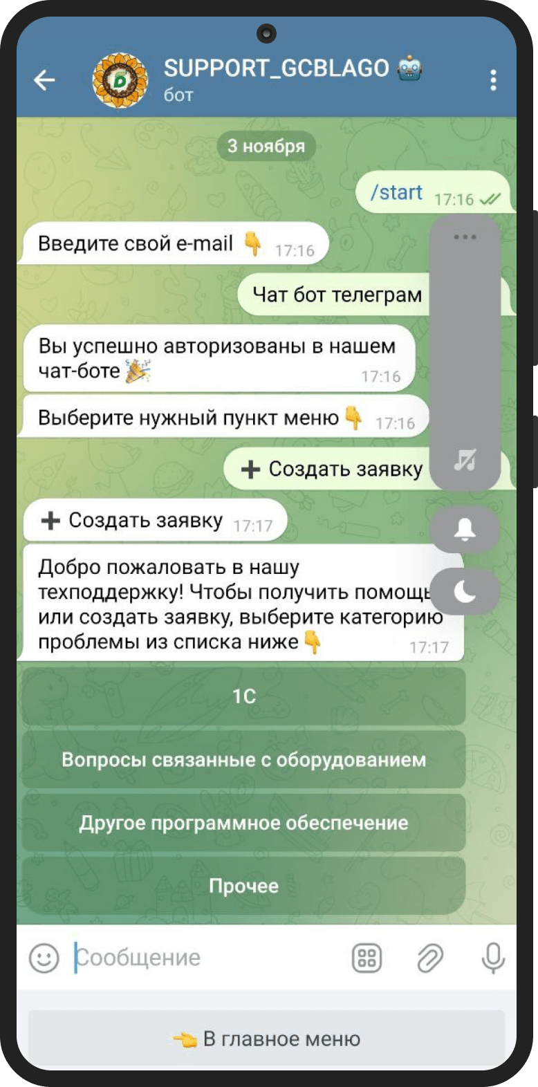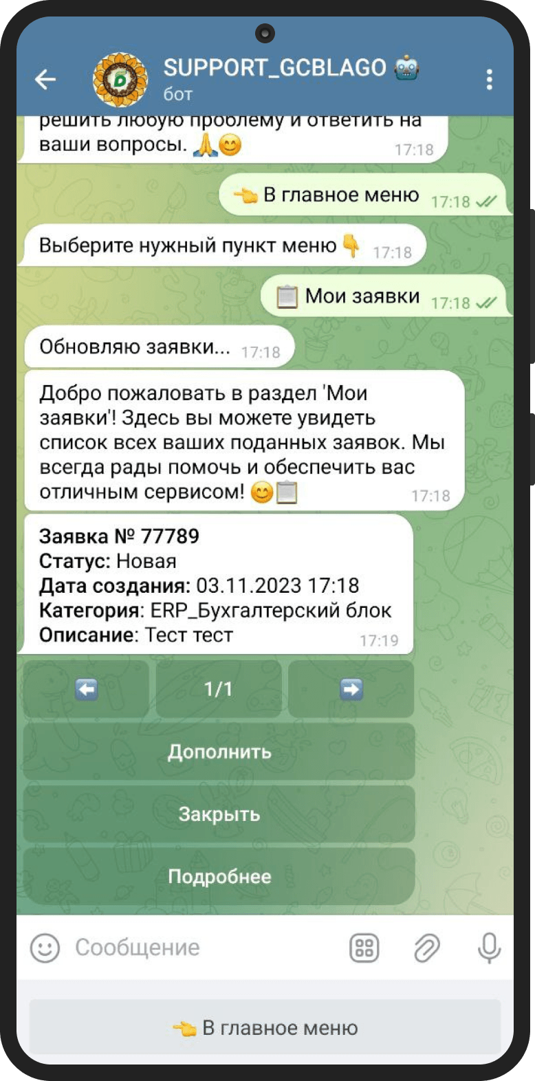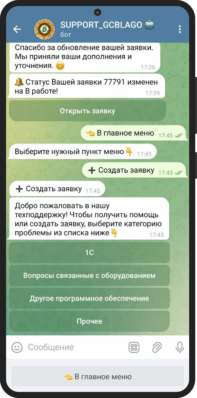 — возможность создать в чат-боте заявку на техподдержку