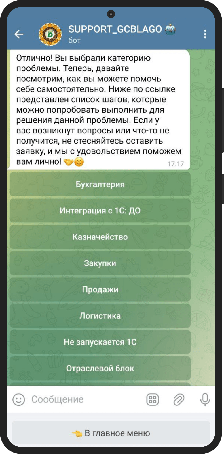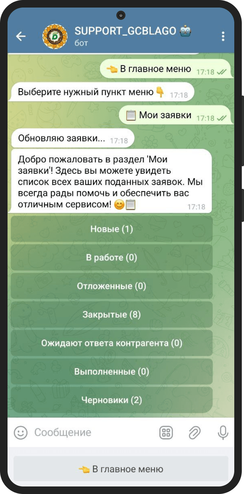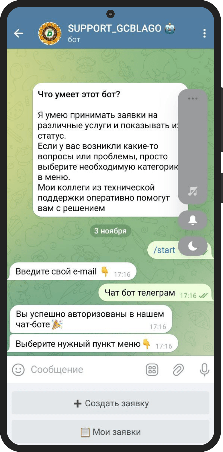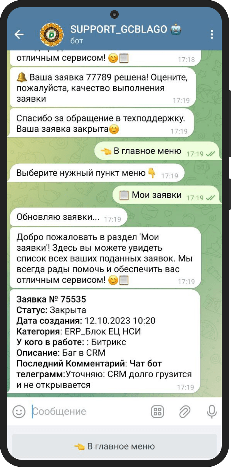 — возможность создать в чат-боте заявку на техподдержку