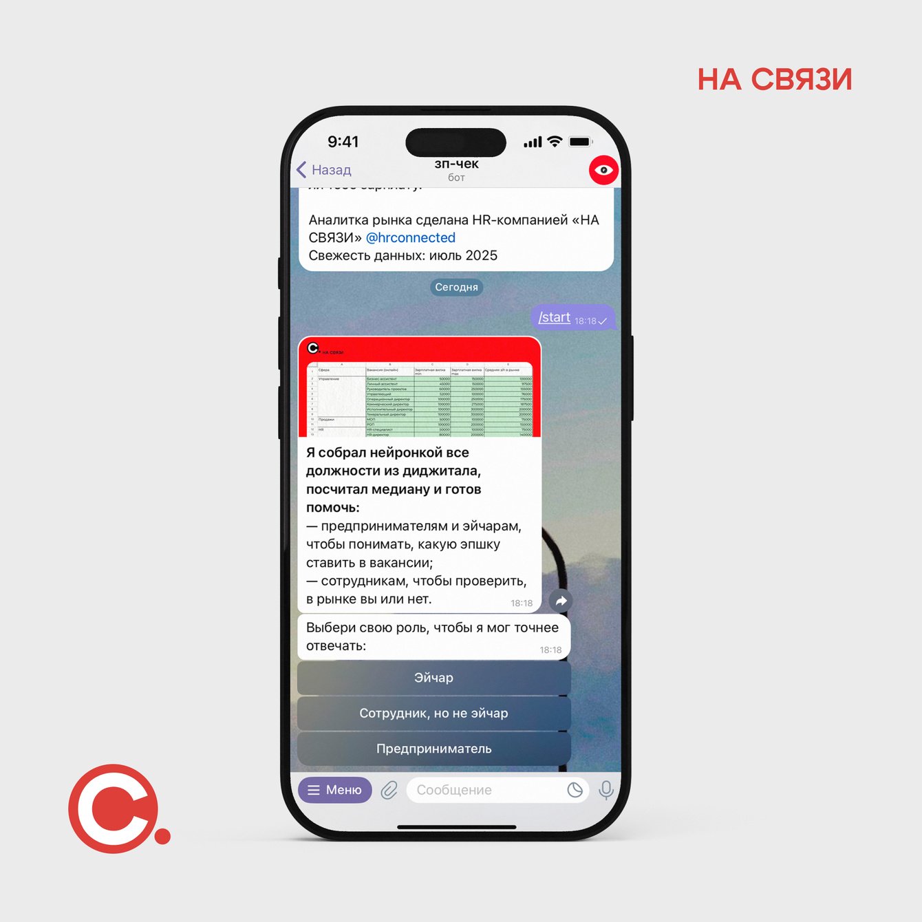 Человек пишет или говорит голосом название диджитал-должности → бот ищет её в базе → выдаёт среднюю зарплату по рынку.