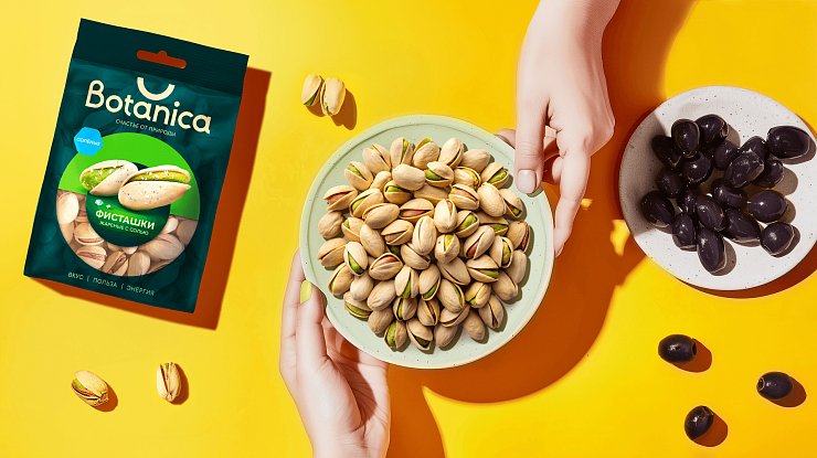 Визуальная подача продукта — гедонистическая. Мы отказались от хаотичного нагромождения еды и сделали ставку на эстетически выверенные аппетитные акценты. Элегантной находкой на упаковке с фисташками послужил маленький алмаз, изображающий соль.