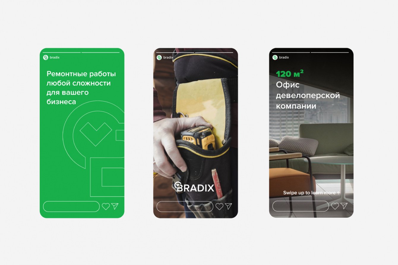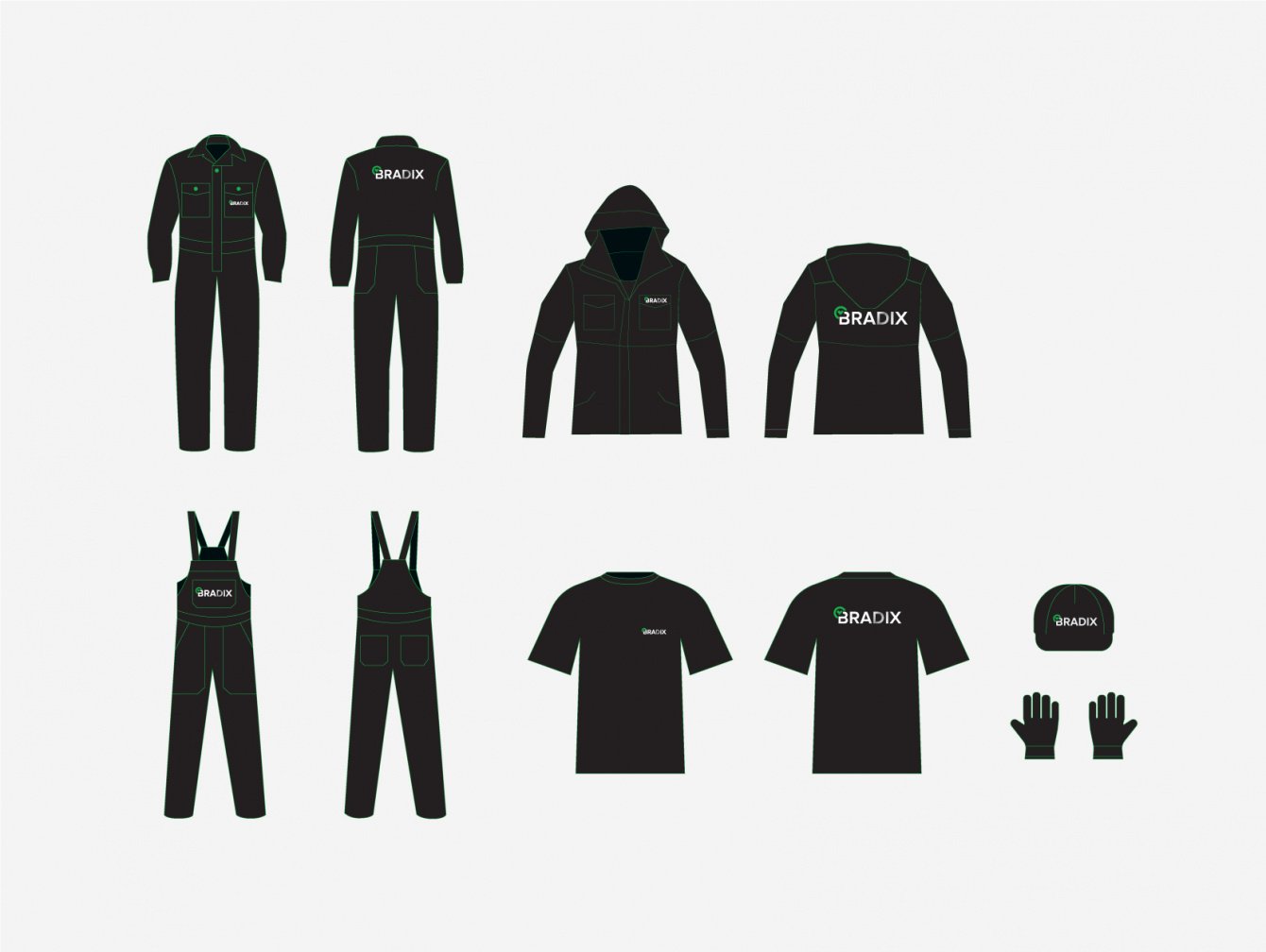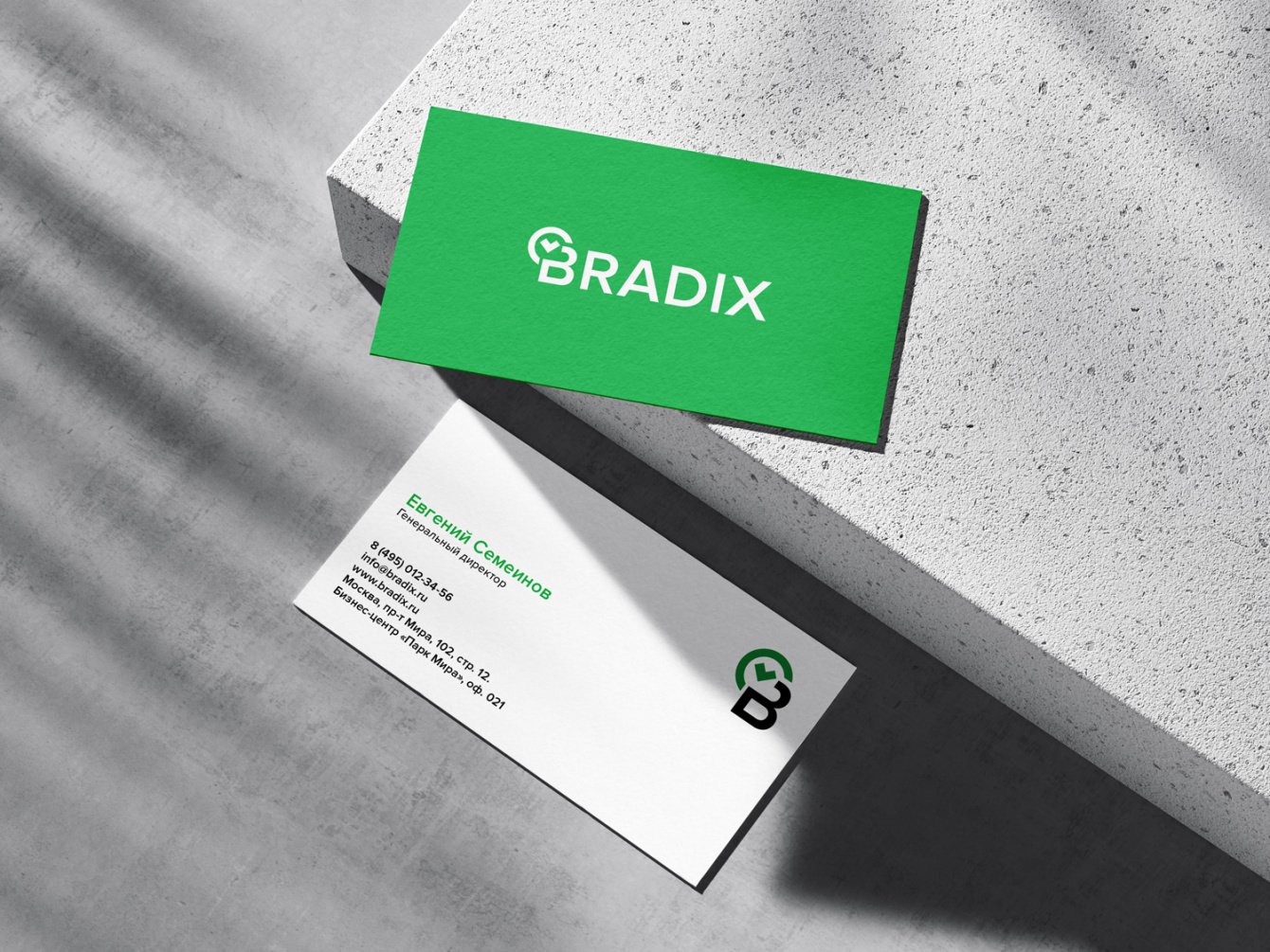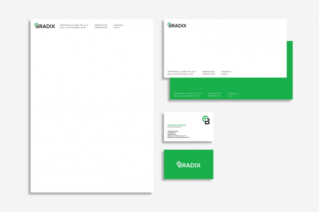 Фирменный стиль Bradix разработан с учетом ее профессионализма и ориентации на оперативное выполнение задач. Зеленый цвет подчеркивает стремление компании к инновациям и усовершенствованию своих услуг