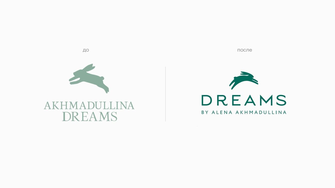 На первое место вынесено слово Dreams. Теперь название произносится DREAMS by Alena Akhmadullina. Кроме изменений в названии самые заметные перемены отражены в фирменном стиле. Изменения коснулись логотипа и фирменного элемента бренда – силуэта зайчика, изображение которого стало более динамичным. Также теперь он «прыгает» слева вправо, в том же направлении, как зритель читает название.
