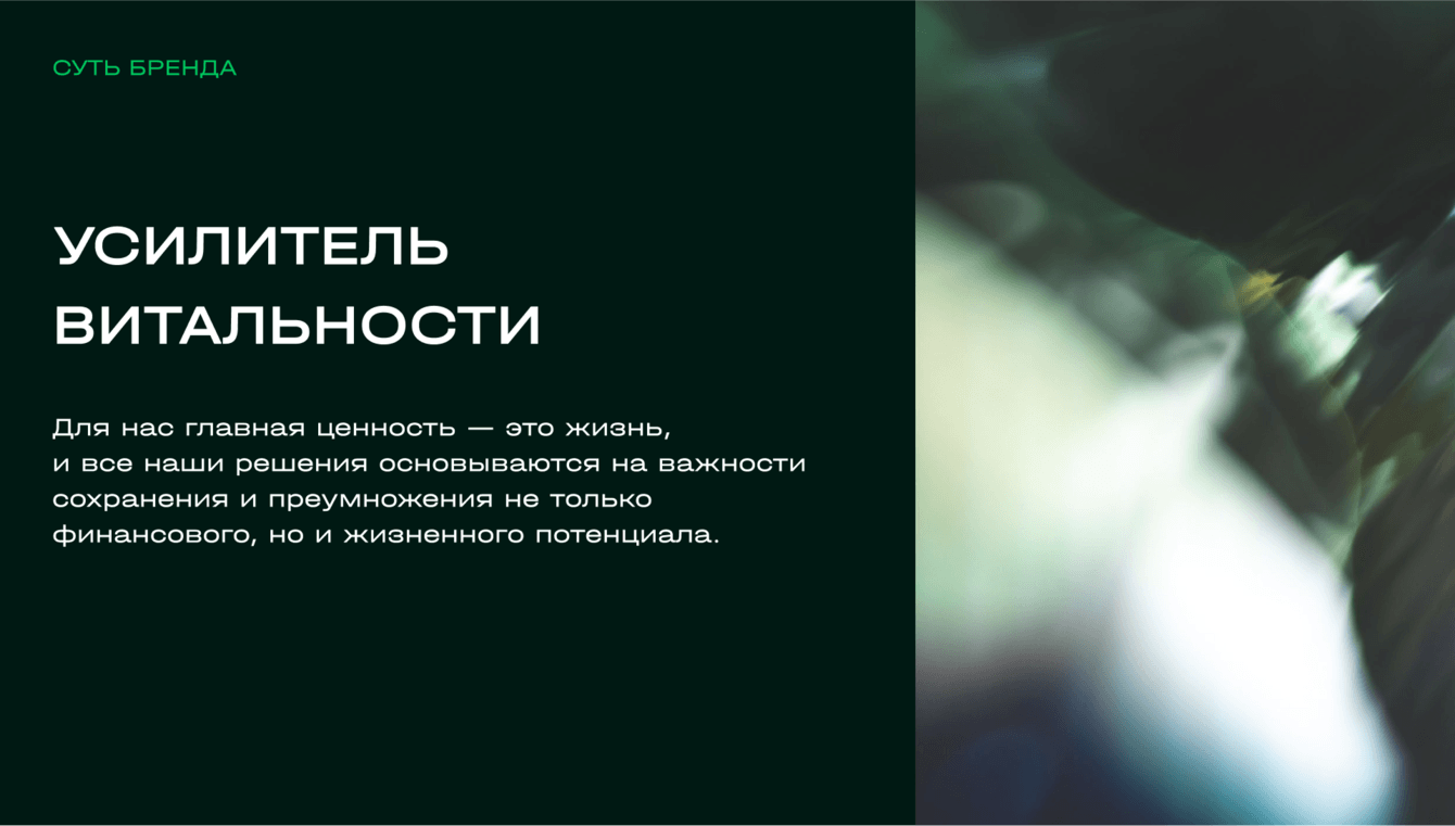Тонкое, эксклюзивное начертание и цветовая палитра, которая имеет технологический окрас матричного тона и на нем яркая зеленая контрастная вспышка. Это совмещение эксклюзивности, изящества, витальности и технологичности в логотипе. Также логотип отлично адаптируется к зонтичному бренду и ко-брендингу с другими проектами.