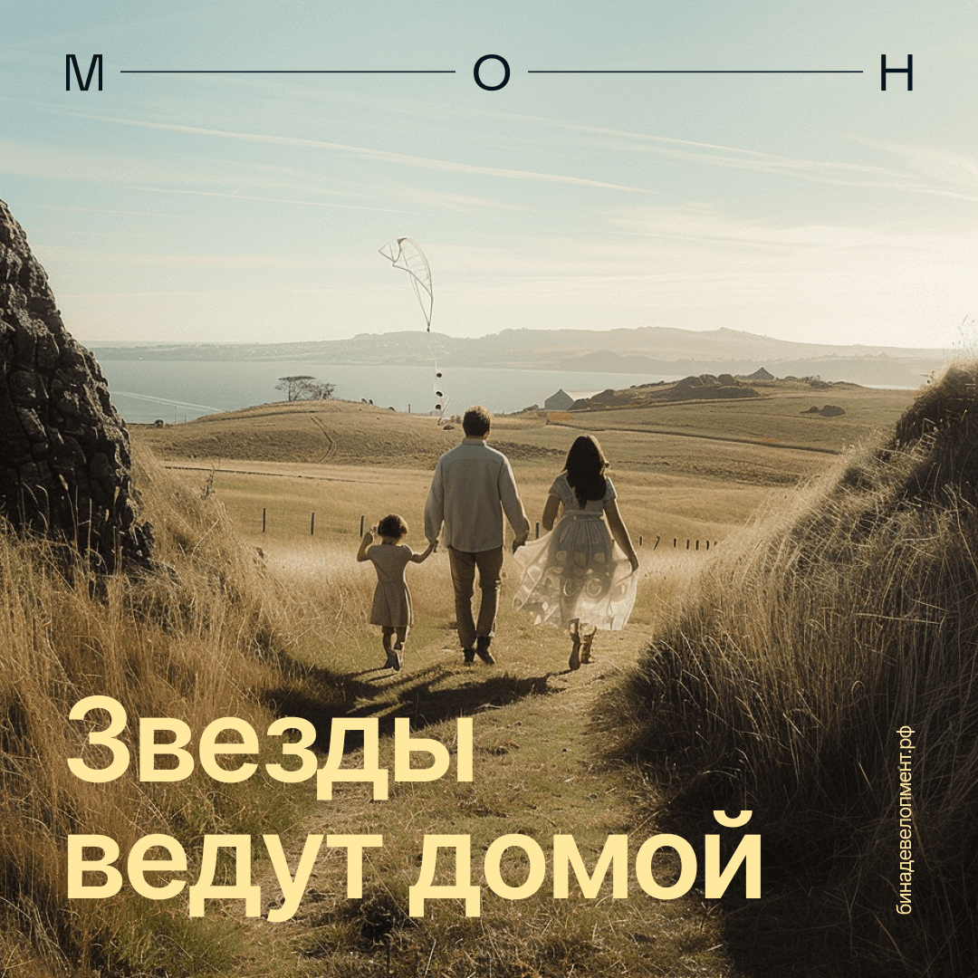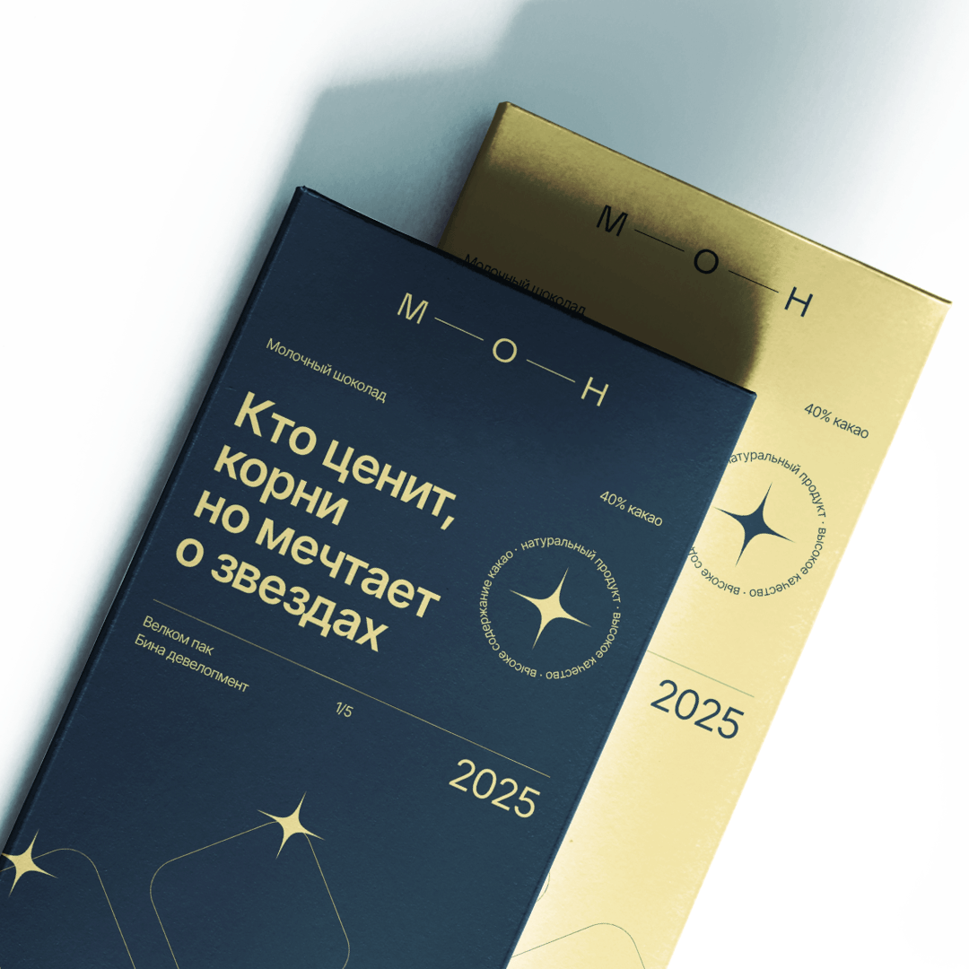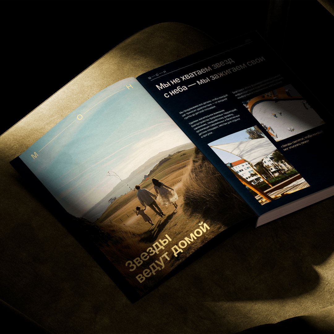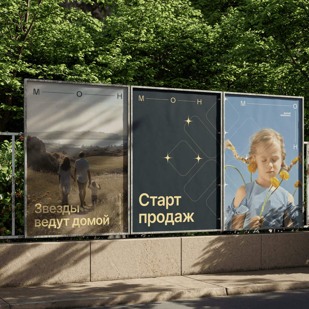 «МОН» — дом для тех , кто ценит надежность и уют, но не готов отказываться от свободы и вдохновения. Мы предложили не «хватать звезды с неба», а зажигать свои — дома. Метафору поддержали и фирменным стилем: логототип стал единым созвездием — его буквы соединены «нитями» и легко перестраиваются. А теплая и «родная» палитра поддержала настроение.