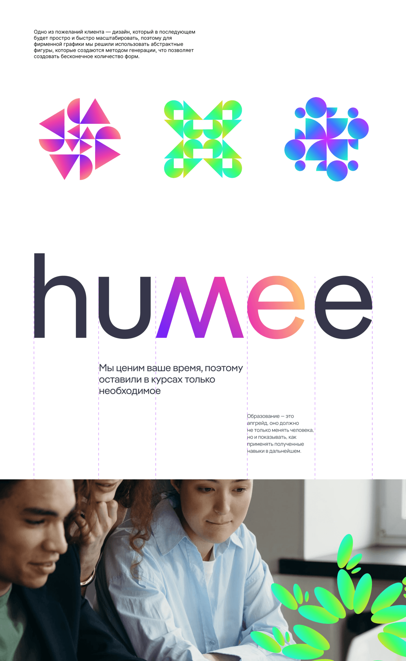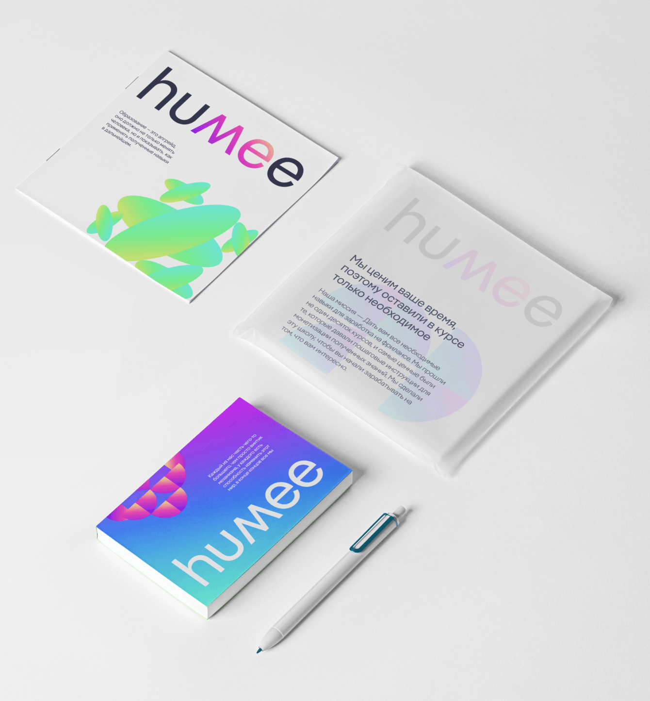 Ребятам требовалось обновить фирменный стиль и выделиться на фоне конкурентов. Мы провели исследование и выявили, что только визуалом отстроиться от конкурентов будет недостаточно, поэтому предложили новую концепцию позиционирования: «Онлайн образование для людей». В основу концепции лег индивидуализм человека и атмосфера взаимопомощи и поддержки, которую мы выразили в слогане «Все мы humee».