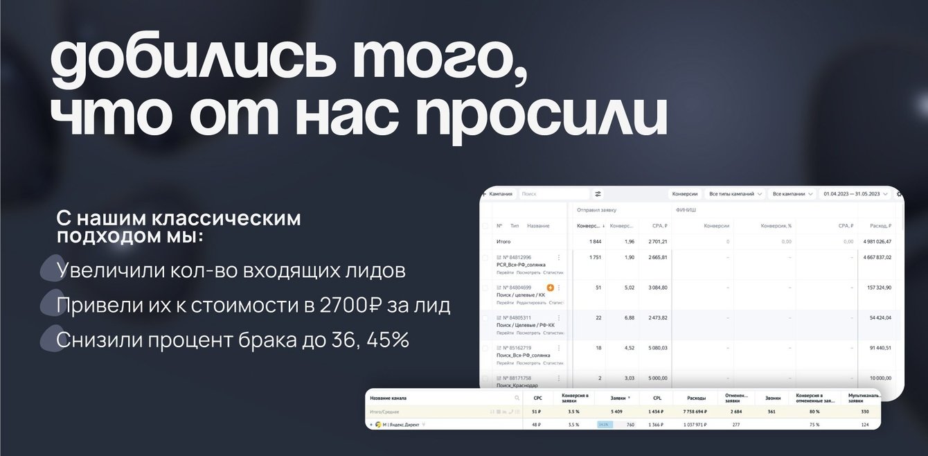 В первые месяцы работы мы делали то, что просит наш заказчик – генерили трафик со всей страны. Основной задачей на этом этапе было удешевление стоимости входящего первичного лида и повышение количества квалифицированных лидов – мы полностью выполнили ее с нашим подходом.