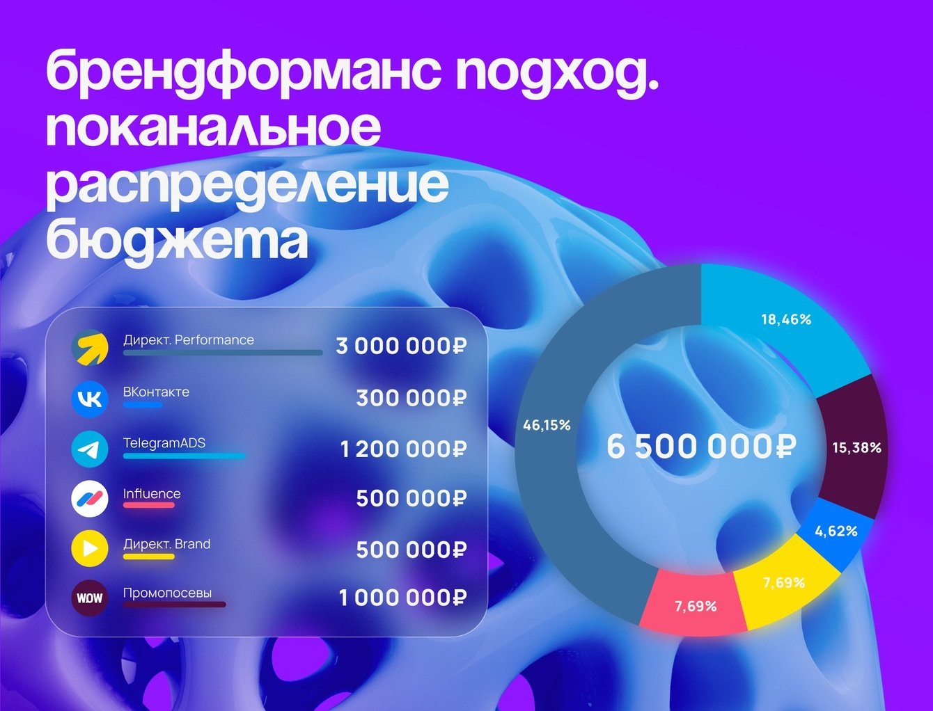 В третьем/четвертом квартале мы еще больше стали сплитить (разделять) бюджет, после чего к нам добавились новые каналы, которые дополнили нашу связку brandformance* стратегии: работа с блоггерами в запрещенной рекламной сети, видеоролик на сервисах яндекса: кинопоиск/видео яндекс, баннеры на поиске и наш главный козырь для усиления стороны перфоманс составляющей – Telegram Ads.