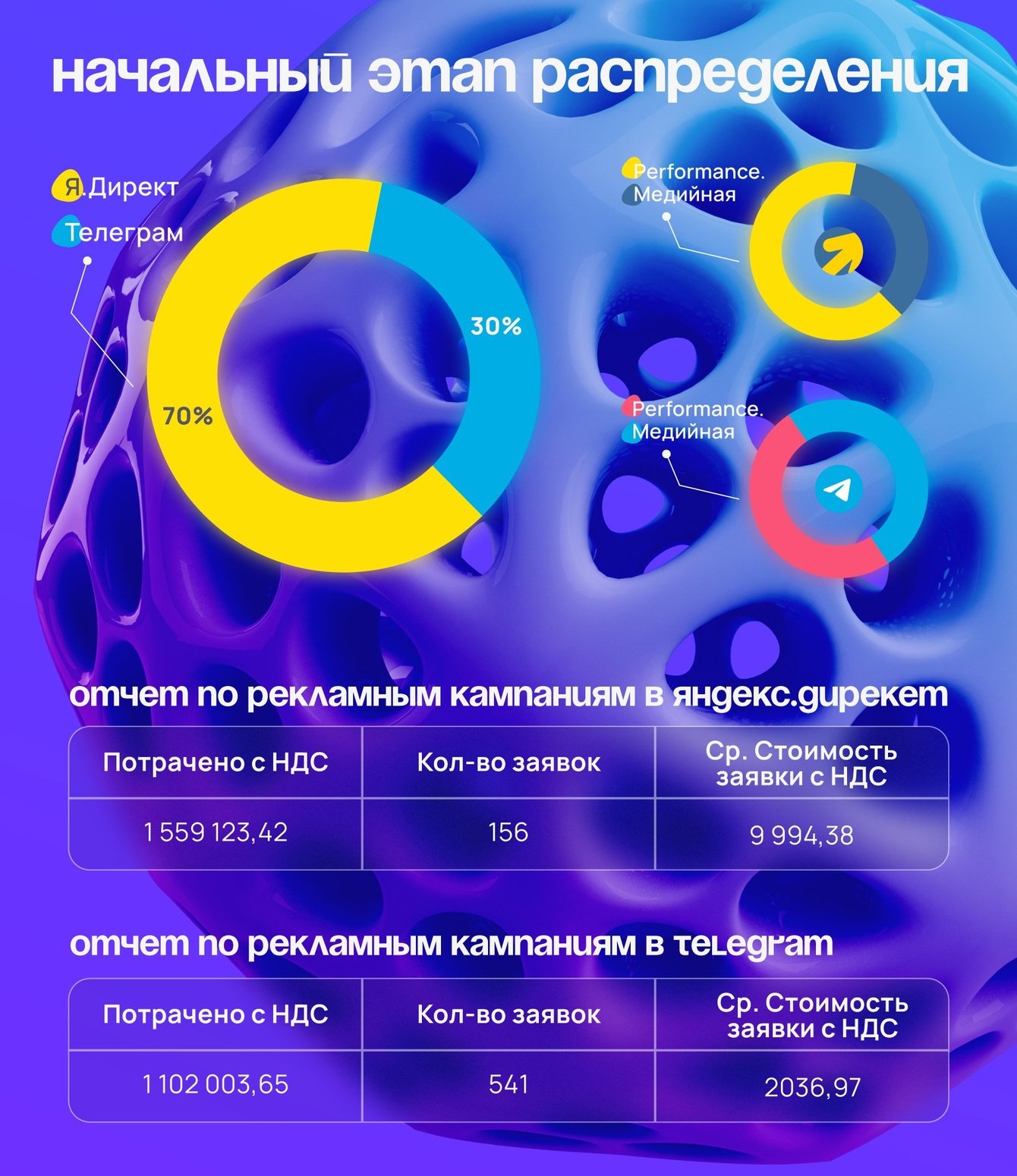 Performace Яндекса и Telegram ADS помогали нам закрыть проблему с поступающими лидами с нашей рекламы, медийная же составляющая работала на прямые обращения в компанию и рост узнаваемости бренда в целевом гео.