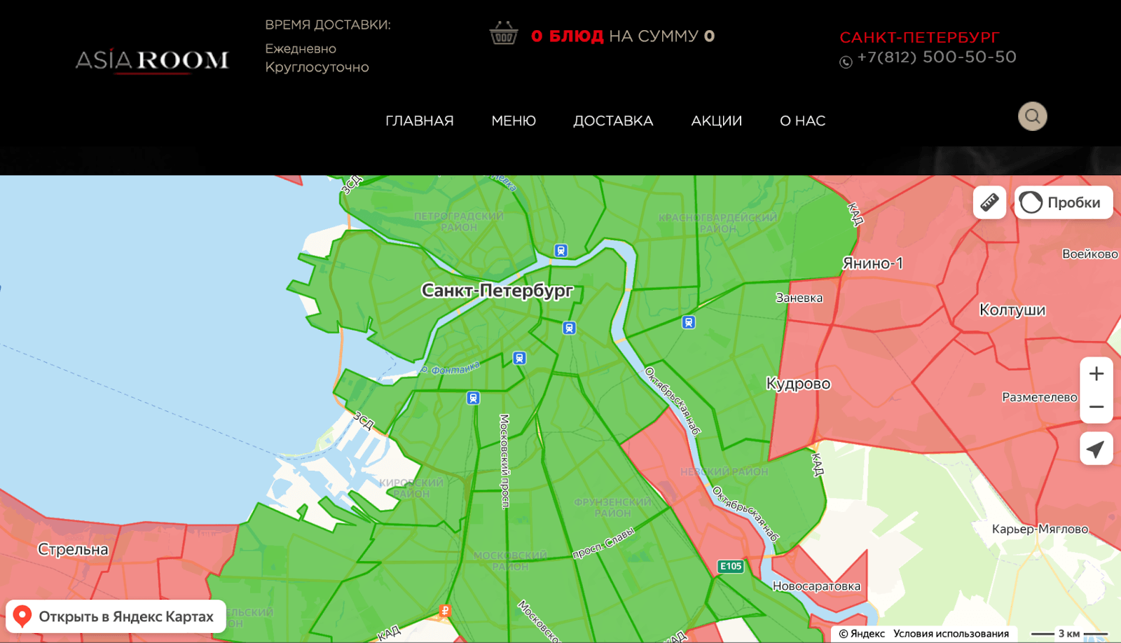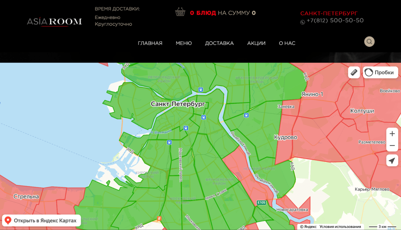 В разделе «Доставка» подключили интерактивную карту Петербурга с зонами, доступными для доставки.