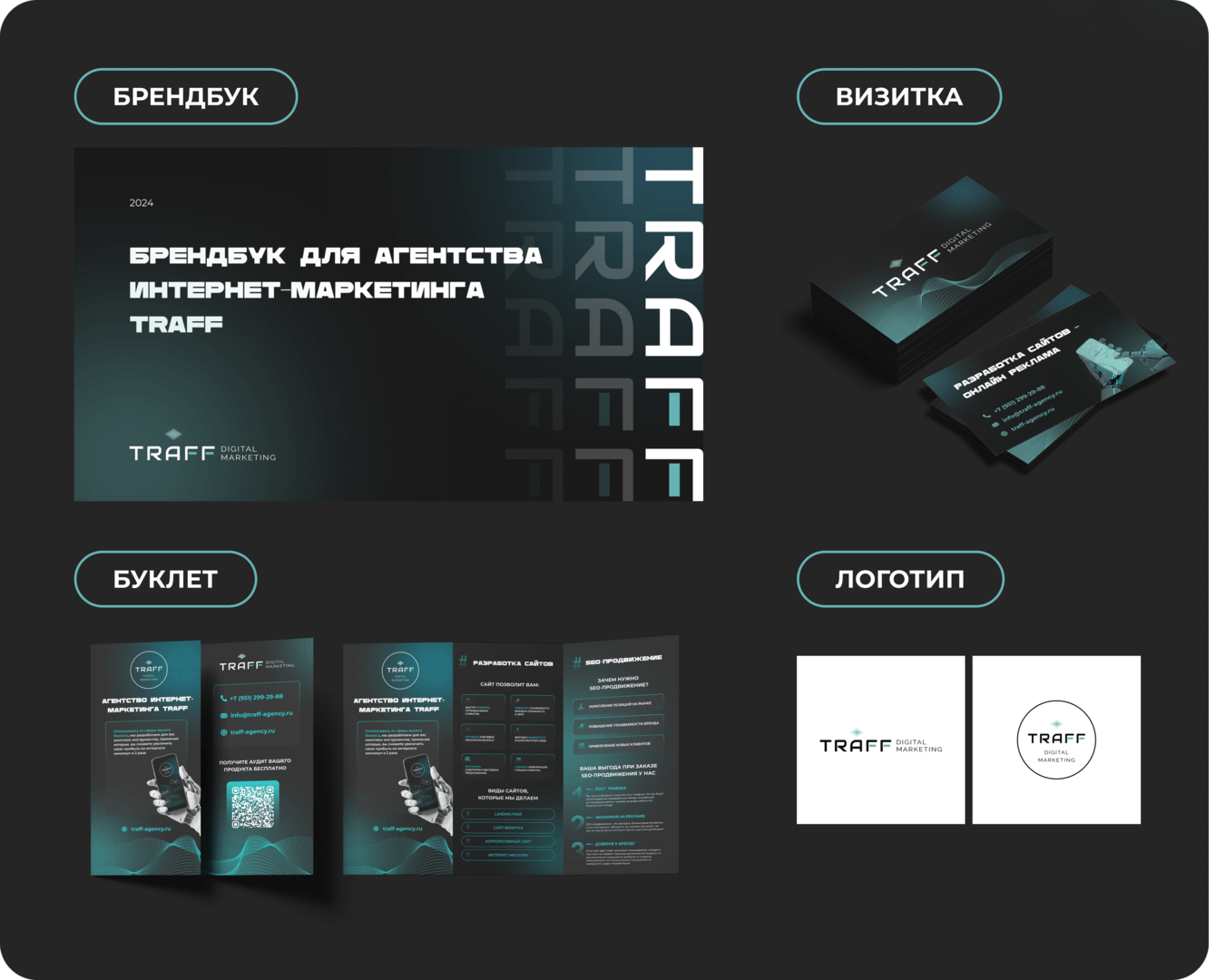 Разработали логотип, который стал основой визуальной идентичности «Трафф». Создали подробный брендбук с четкими рекомендациями по использованию фирменных цветов, шрифтов и графических элементов, чтобы сохранить целостность бренда во всех точках контакта. Для презентации услуг и общения с клиентами подготовили стильный буклет и визитку, выдержанные в едином дизайне и подчеркивающие профессионализм агентства.