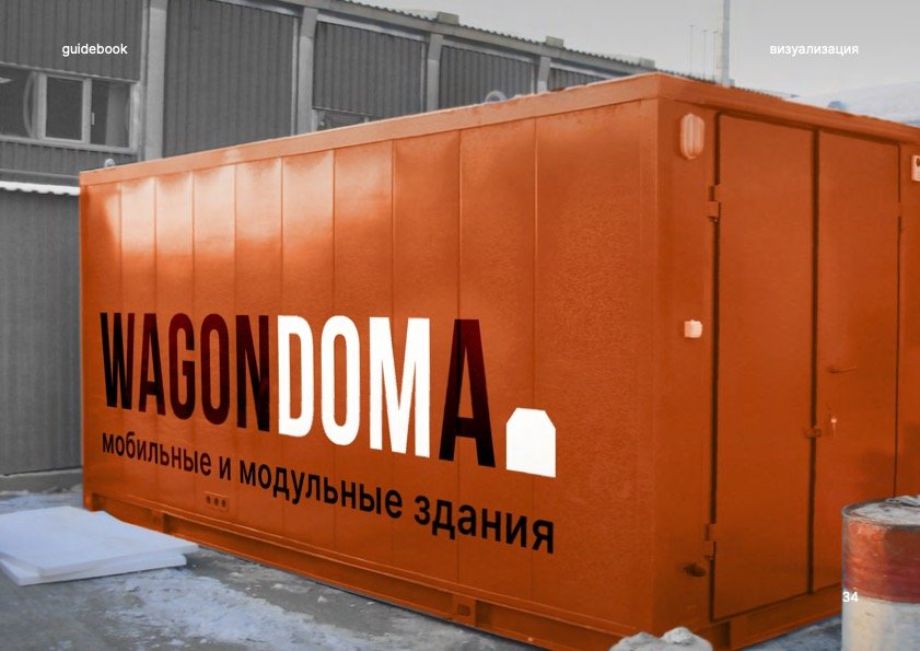 Знак логотипа — форма торца вагон-дома дома. На этой форме строится вся графическая изобразительность проекта. Яркий акцентный запоминающийся фирменный цвет. Минималистичный, технологичный, модульный подход к фирменному стилю.