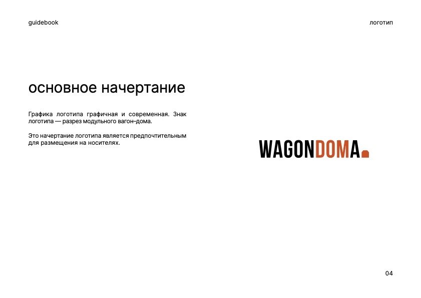 В результате разработки гайдбука для компании, мы создали уникальный и эффективный фирменный стиль, который отражает суть и ценности компании. Знак логотипа, основанный на форме торца вагон-дома, стал основой для всей графической концепции проекта. Его яркий акцентный цвет привлекает внимание и запоминается, делая бренд компании узнаваемым.