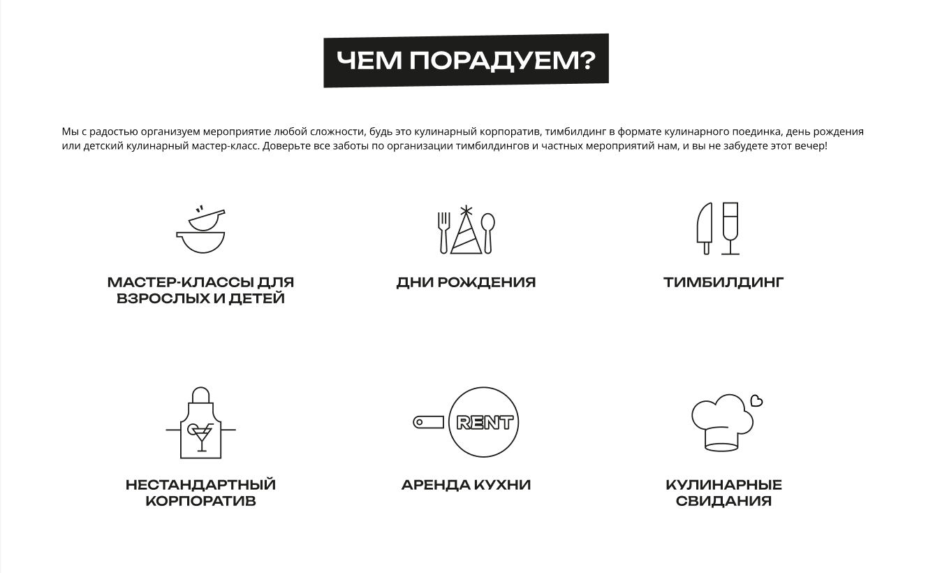 2 шефа из Санкт-Петербурга решили заняться обучением кулинарного мастерства. Перед нами стояла задача полностью оформить бренд, создать брендбук (так как в дальнейшем планируется продажа франшизы), создать сайт и привлечь клиентов в 2 этапа: