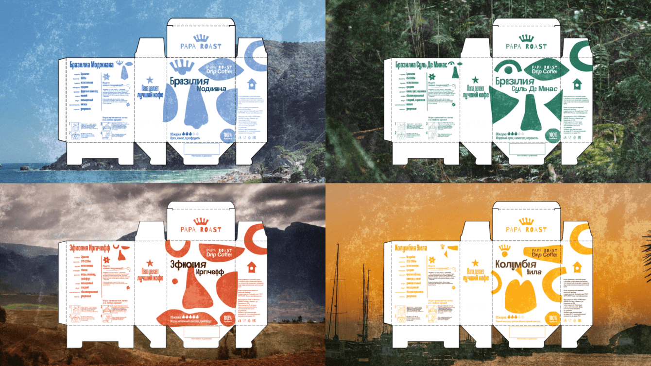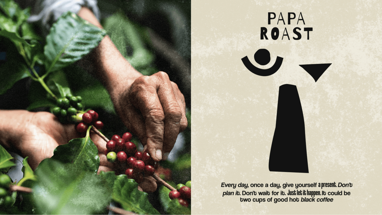 При разработке этой метафоры мы опирались на логотип бренда. Дословный перевод: Papa Roast – «Папа жарит», плюс отсылка к известной рок-группе. В этом случае мы предложили развить персонаж, Папу-бунтаря, который путешествует по всем уголкам мира в поисках кофе. Папа жарит кофе, папа ищет кофе.