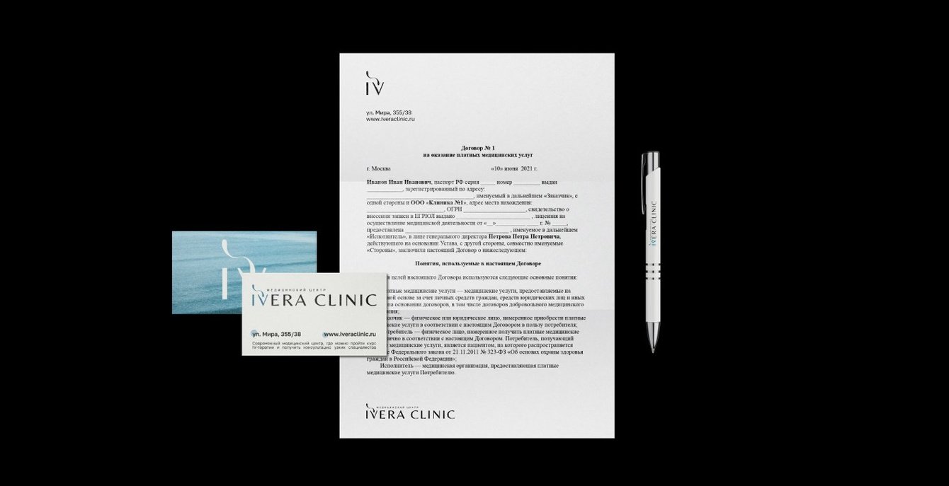 Клиент: медицинская клиники IVERA CLINIC. Задача: создание фирменного стиля, придумать название бренда, логотип и брендинг.