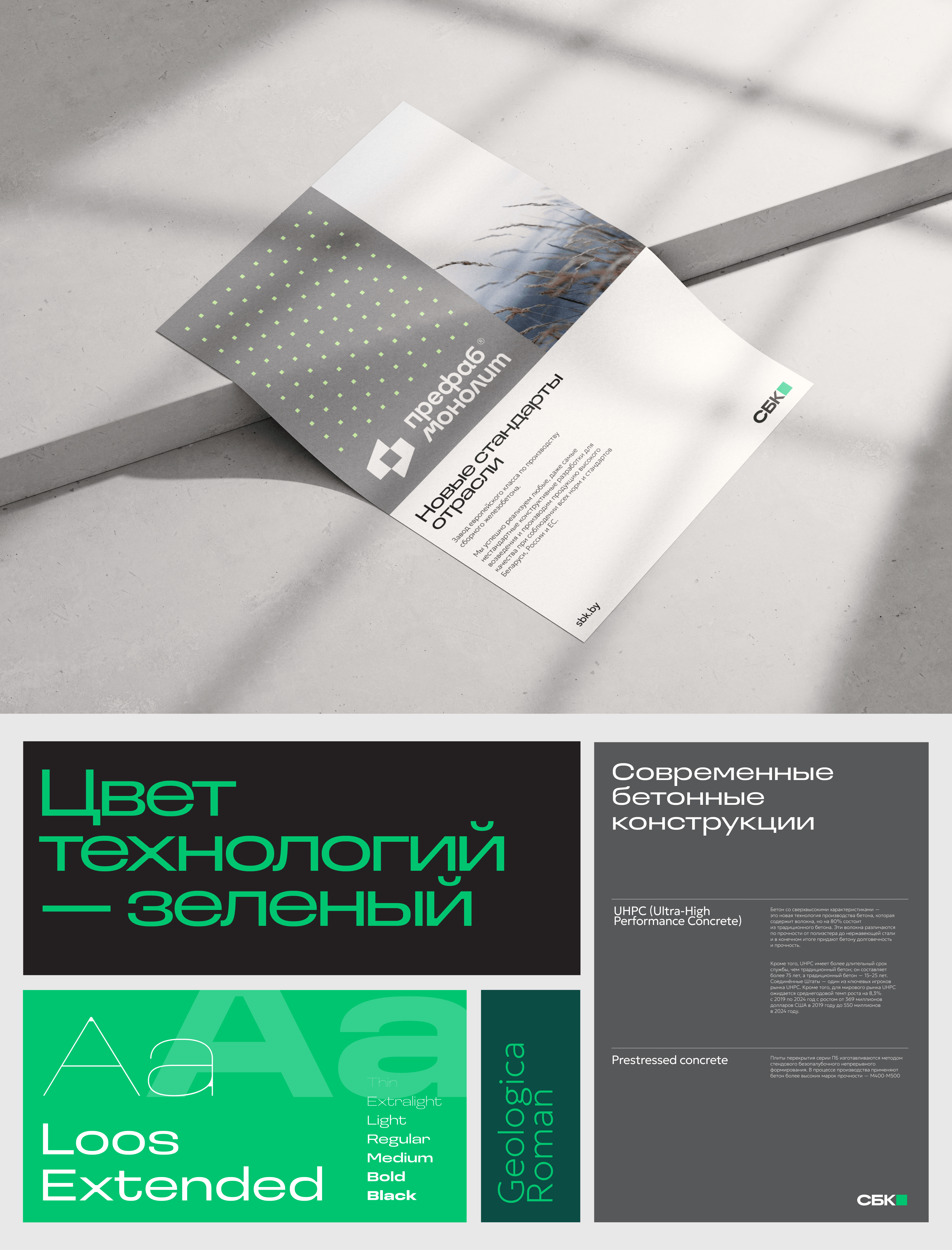 Супергарнитура Loos легла в основу типографической идентичности бренда. Выбранный шрифт поддерживает эстетику конструктивизма и минимализм логотипа СБК.
