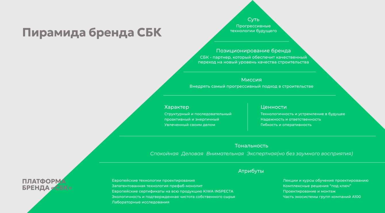Результатом нашей работы стала комплексная система айдентики, развивающая платформу бренда. Ключевыми решениями, поддерживающими бренд, стали элементы настоящих конструктивных и технических решений оригинальной технологии СБК, превратившие продукты и технологические цепочки в выразительные узнаваемые точки коммуникации.
