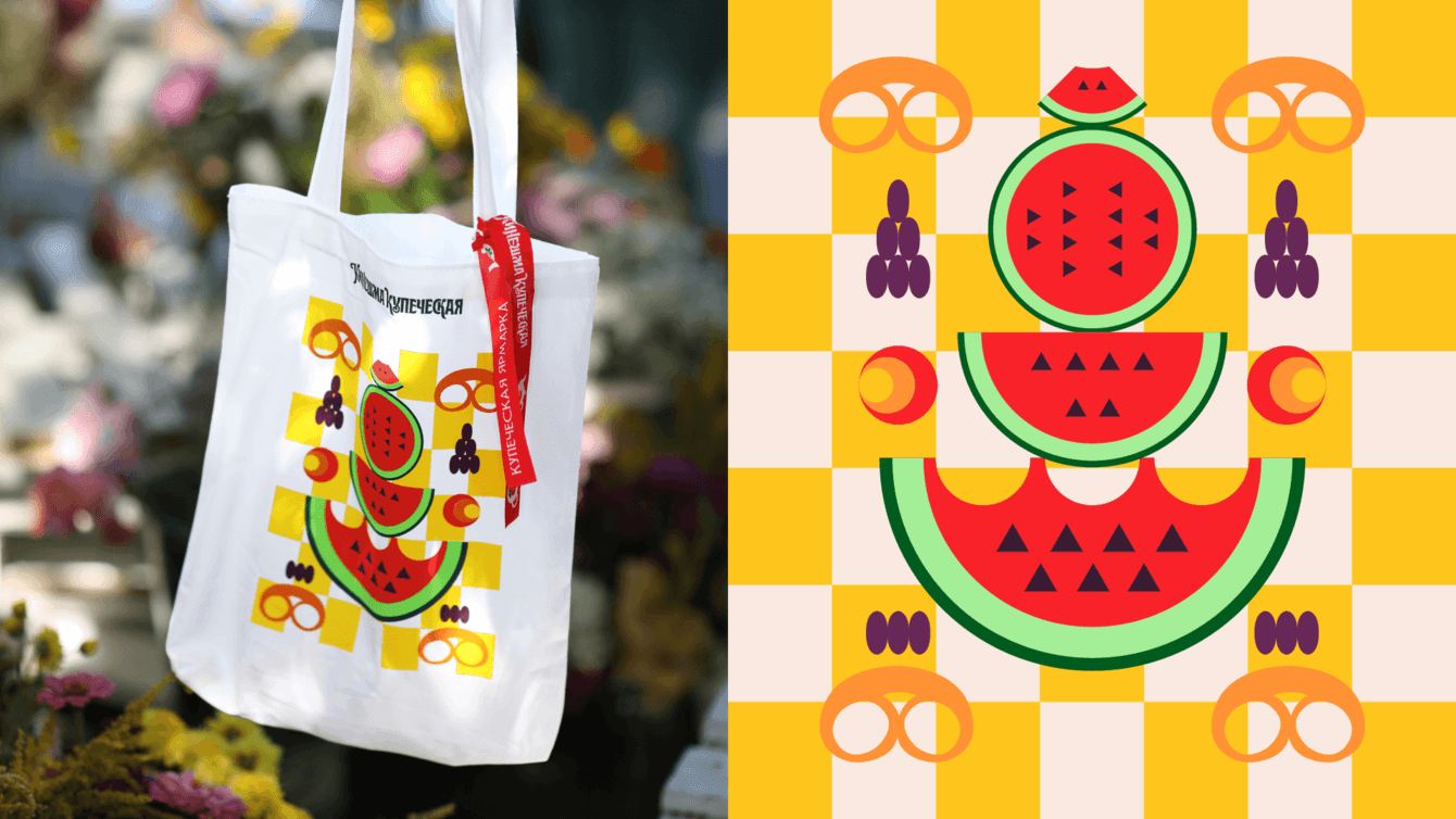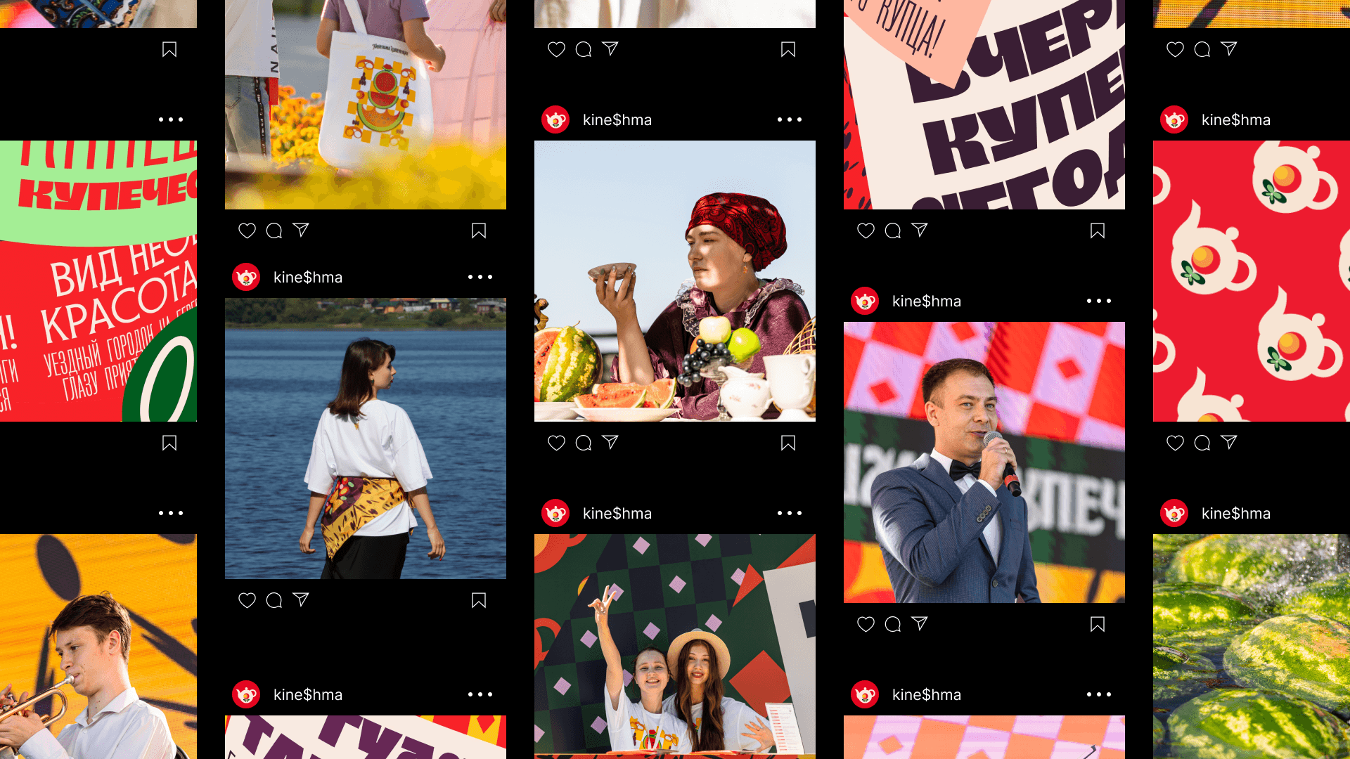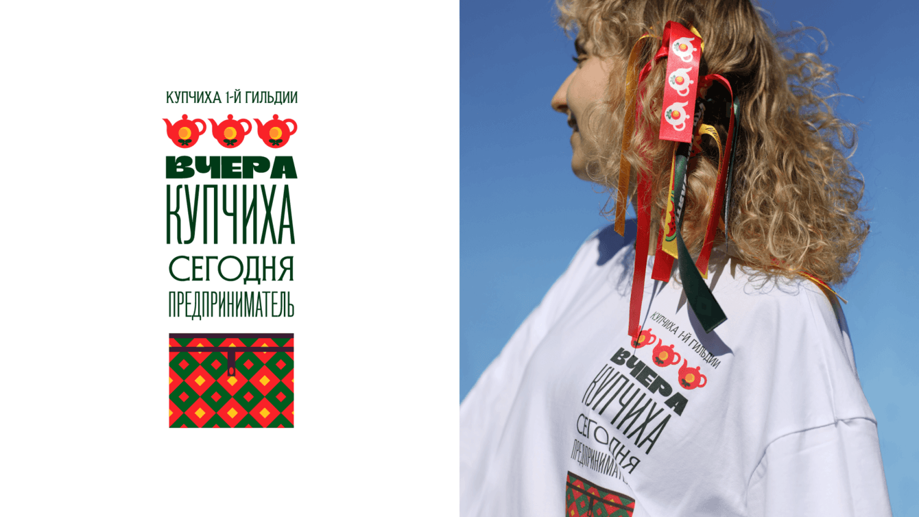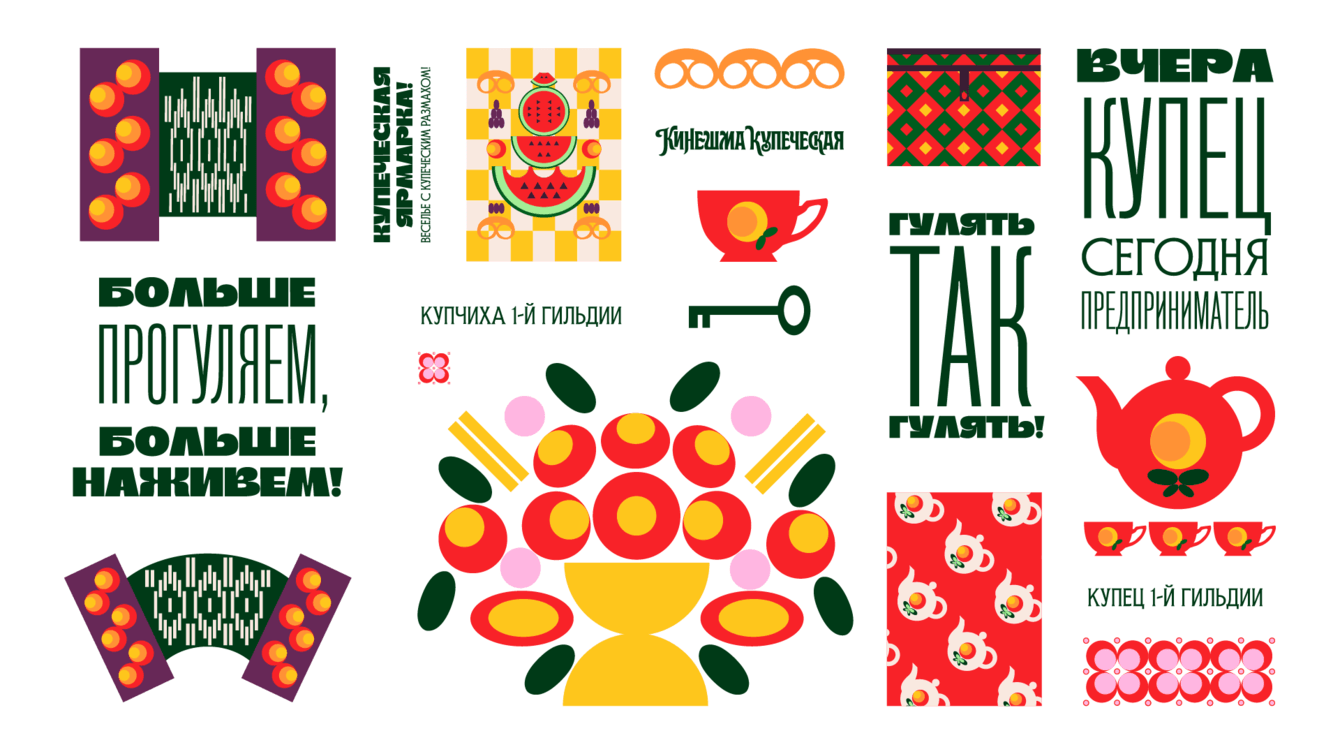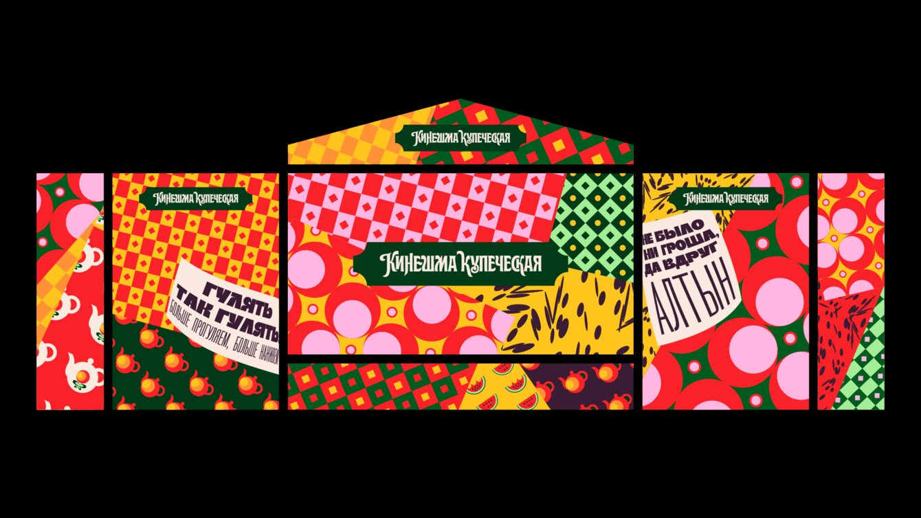 Визуальный образ — это современная стилизация дореволюционных плакатов и рекламных листков. Наслаиваясь друг на друга на афишных тумбах, они заполняют всю поверхность носителей и передают кипучую жизнь того времени. Для создания иллюстраций мы вдохновлялись картинами Кустодиева. Метафора фирменного стиля — карусель купеческих историй.