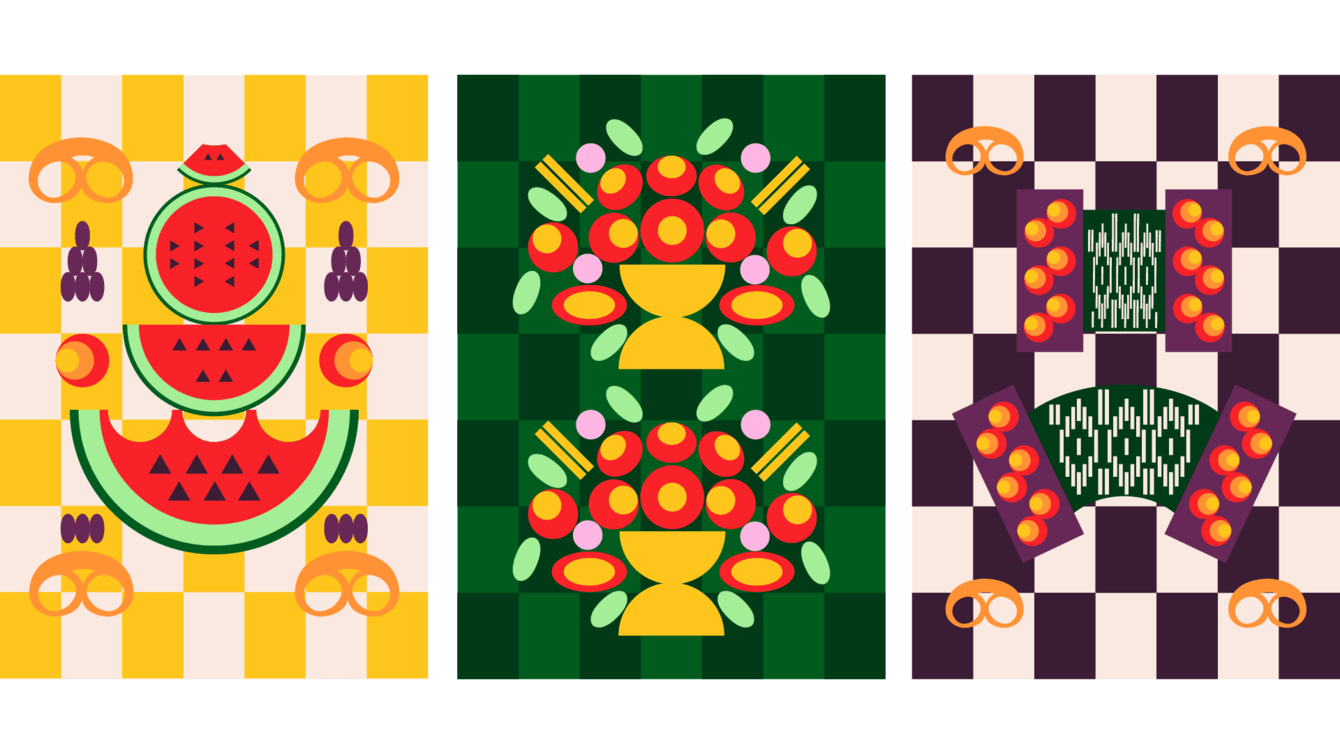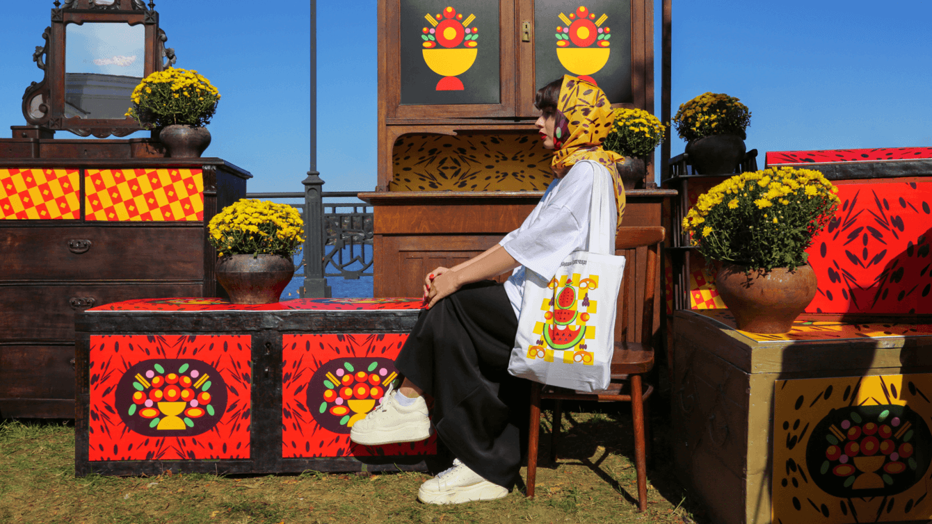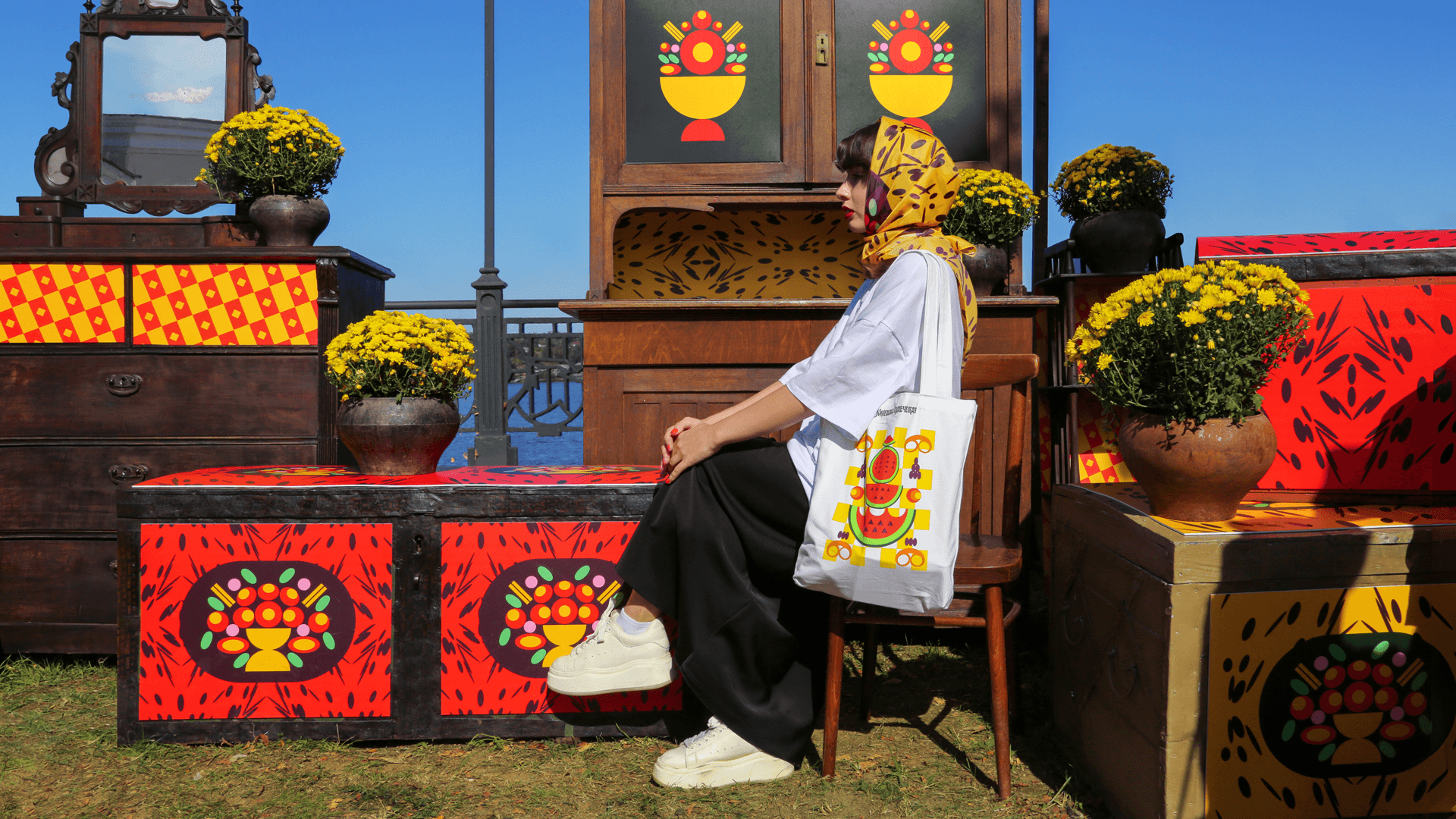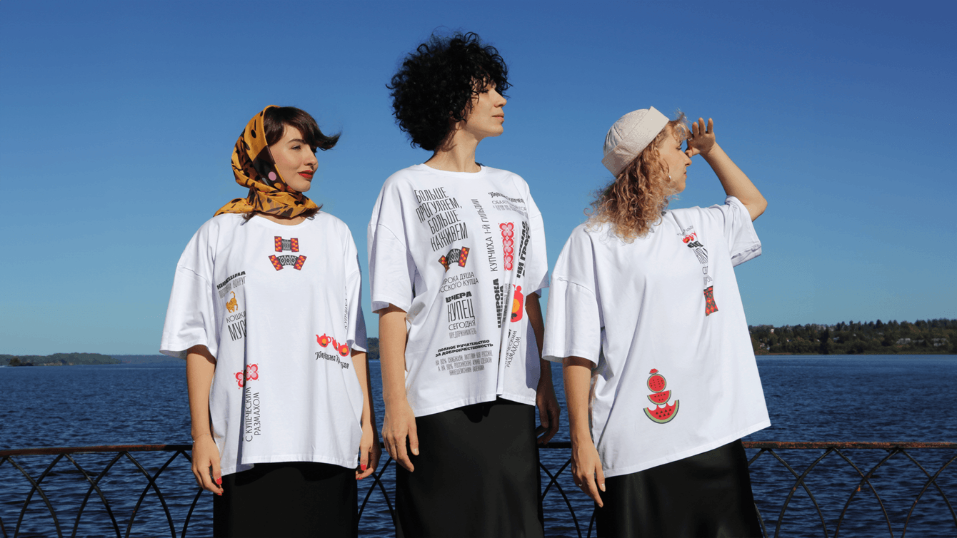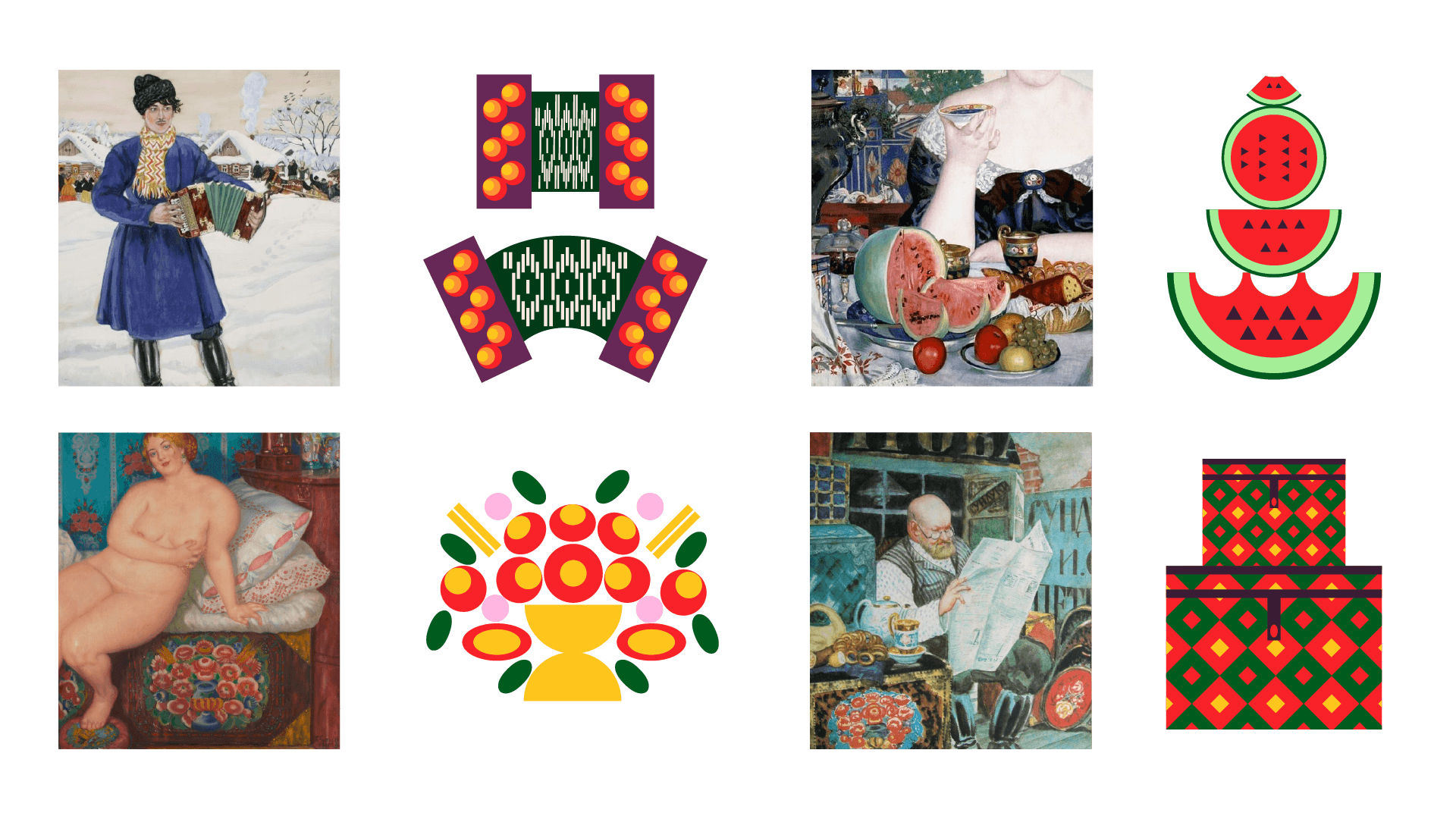 Визуальный образ — это современная стилизация дореволюционных плакатов и рекламных листков. Наслаиваясь друг на друга на афишных тумбах, они заполняют всю поверхность носителей и передают кипучую жизнь того времени. Для создания иллюстраций мы вдохновлялись картинами Кустодиева. Метафора фирменного стиля — карусель купеческих историй.