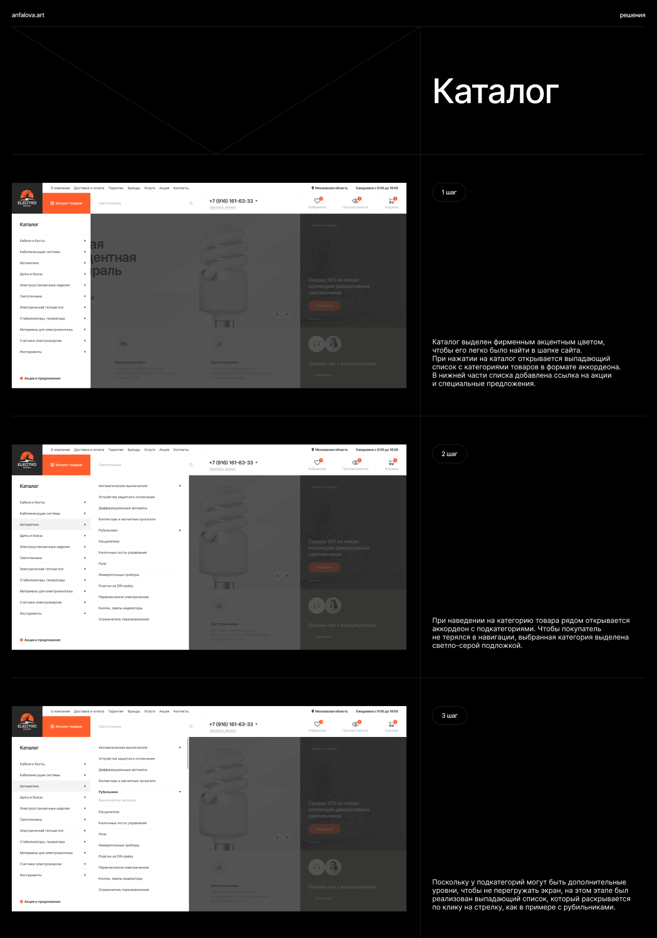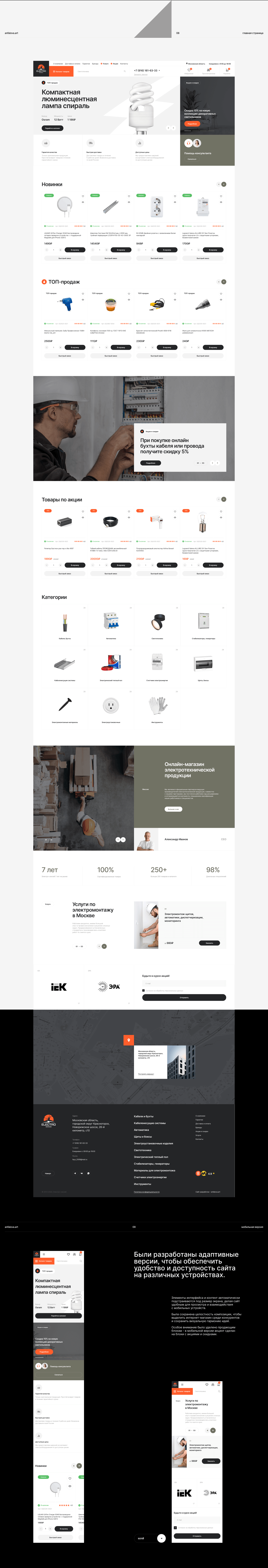 В результате разработки получился современный, удобный и функциональный сайт для магазина электрооборудования. Благодаря продуманной структуре и интуитивному интерфейсу пользователи легко находят нужные товары, фильтруют их по характеристикам и совершают покупки. Темный стиль с яркими акцентами делает дизайн технологичным и запоминающимся, а удобные CTA-кнопки и онлайн-сервисы повышают конверсию заказов.