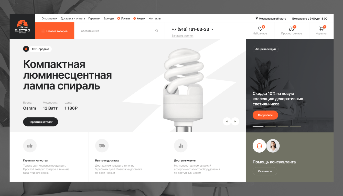 Главная страница создаёт первое впечатление о магазине и подчеркивает его профессионализм и технологичность.