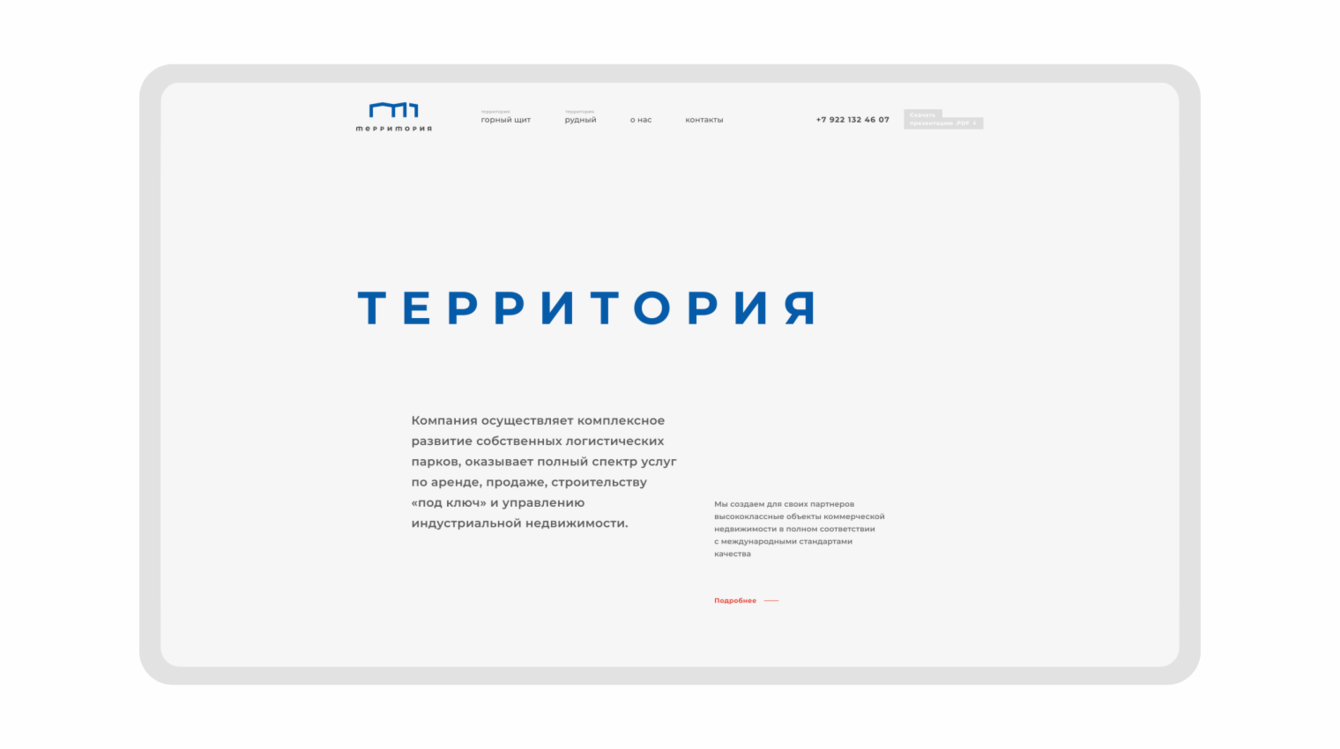 Провели комплекс работ по созданию бренда, включающий в себя: разработку названия — Территория, создание визуальной идентификации (логотип и систему стиля), ключевых макетов носителей фирменного стиля и гайдбука, дизайн сайта и основных цифровых материалов.