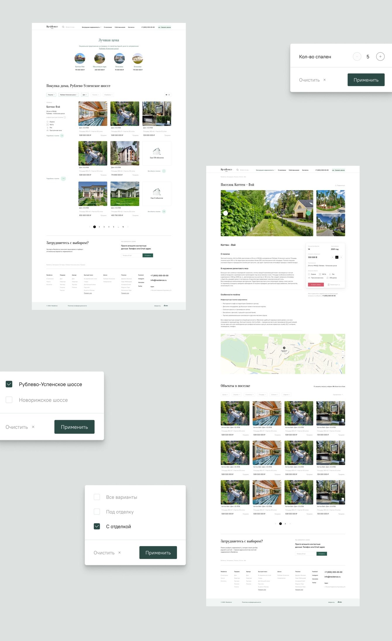 Мы добавили поиск по фильтрам. Клиент может выбрать предложения исходя из цели своего присутствия: аренды или продажи. Также можно воспользоваться быстрым поиском по категориям или выбрать шоссе, на котором должна располагаться недвижимость. Отдельно разработали страницу для собственников жилья. Перечислили основные преимущества компании и добавили форму обратной связи.
