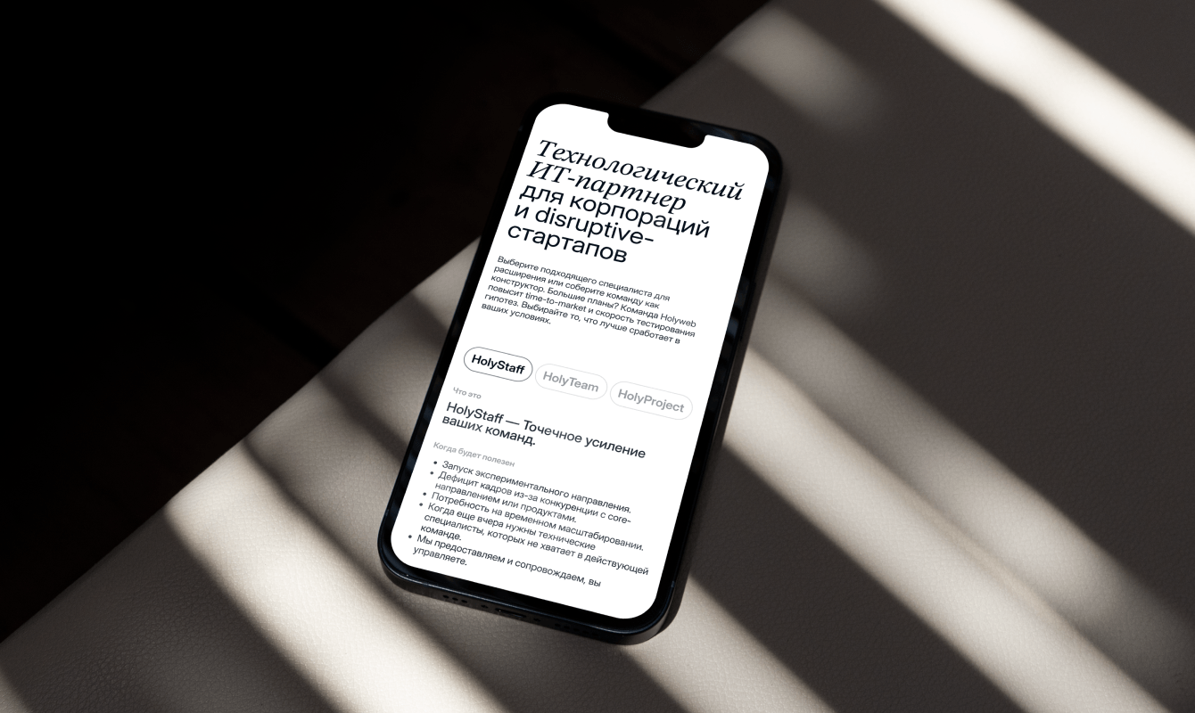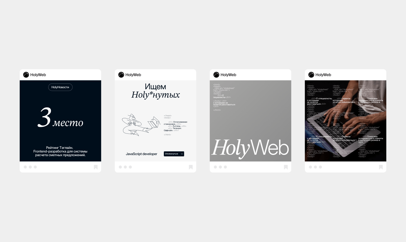 В рамках ребрендинга Holyweb, перед нашей студией стояла задача создать новую систему визуальной коммуникации, которая соответствовала бы обновленному позиционированию компании. Holyweb стремились заявить о себе как о зрелых профессионалах с высокой экспертизой, не теряя игривости и иронии предыдущего стиля.