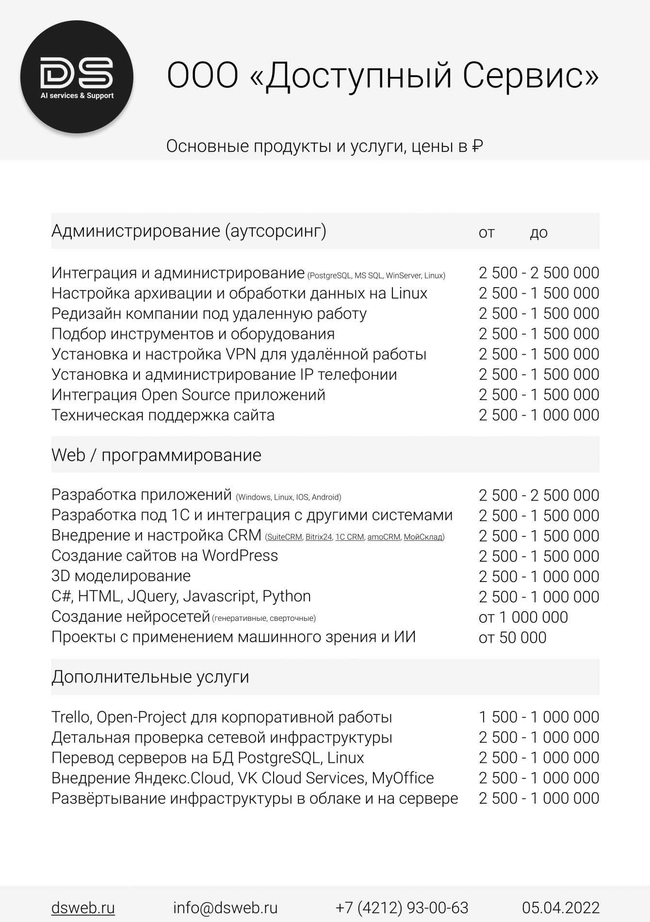 Все это создает узнаваемый, технологичный и в то же время эмоциональный образ компании. Одна из ообенностей ниши — условия разработки каждого проекта расчитываются индивидуально для заказчиков. Поэтому было принято решение разработать прайс-лист с ценами «от и до».