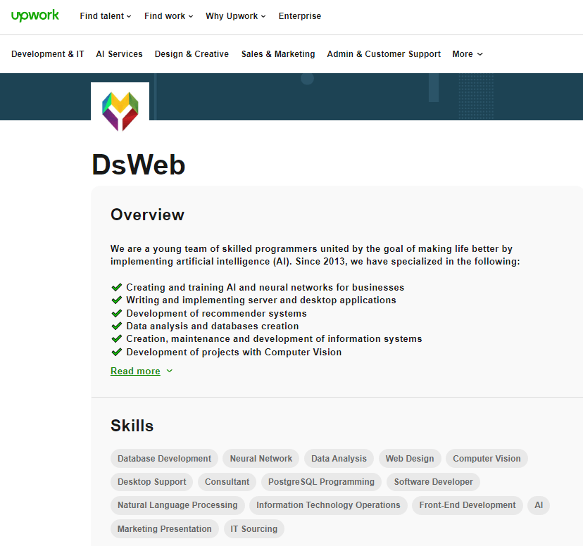 Веб-странца компании на международной фриланс-бирже Upwork (бывш. Elance-oDesk)