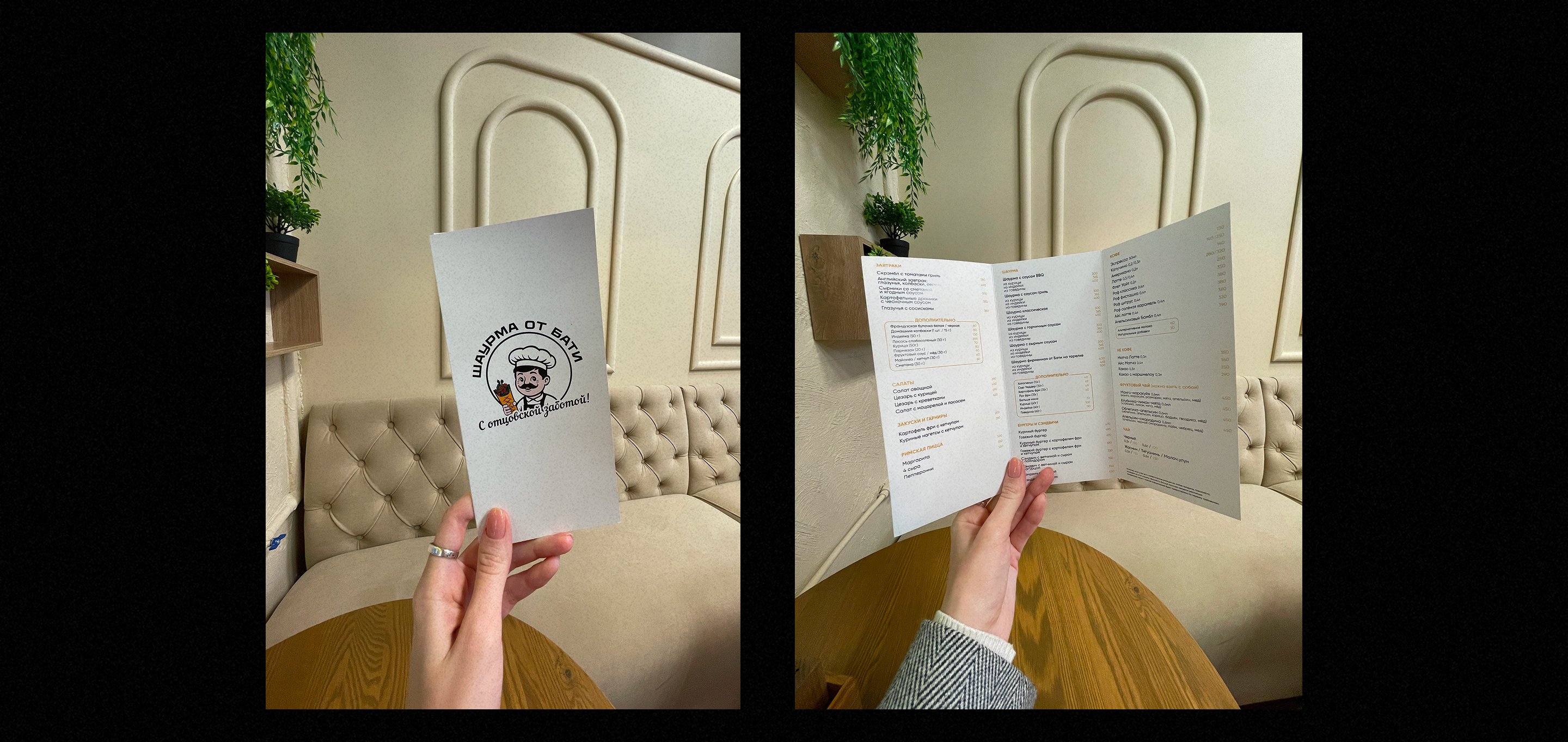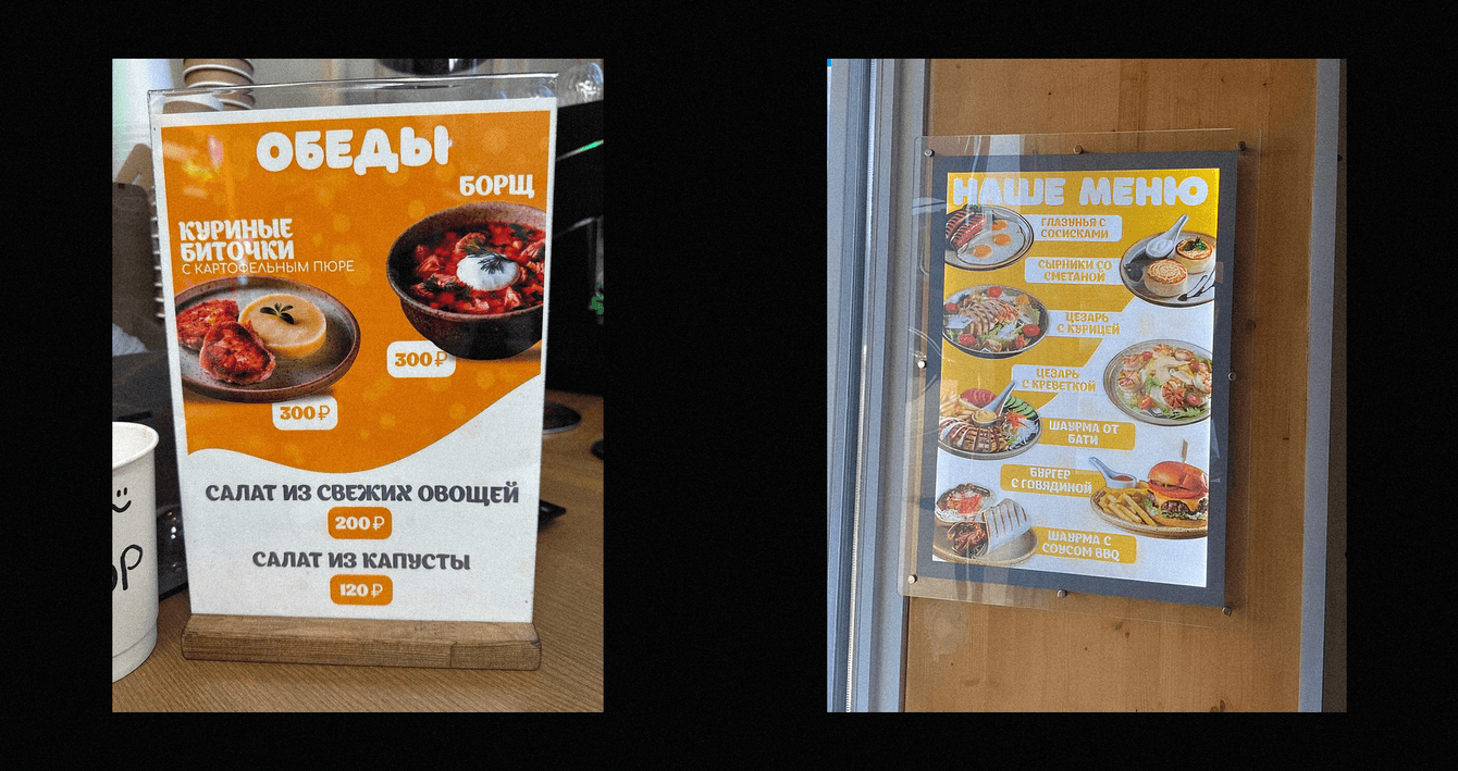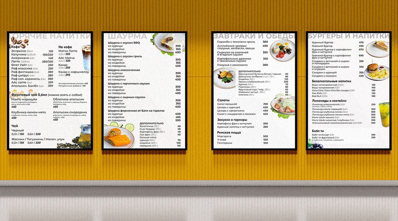 Разработать меню над кассовой зоной и печатное меню на столы, рекламную