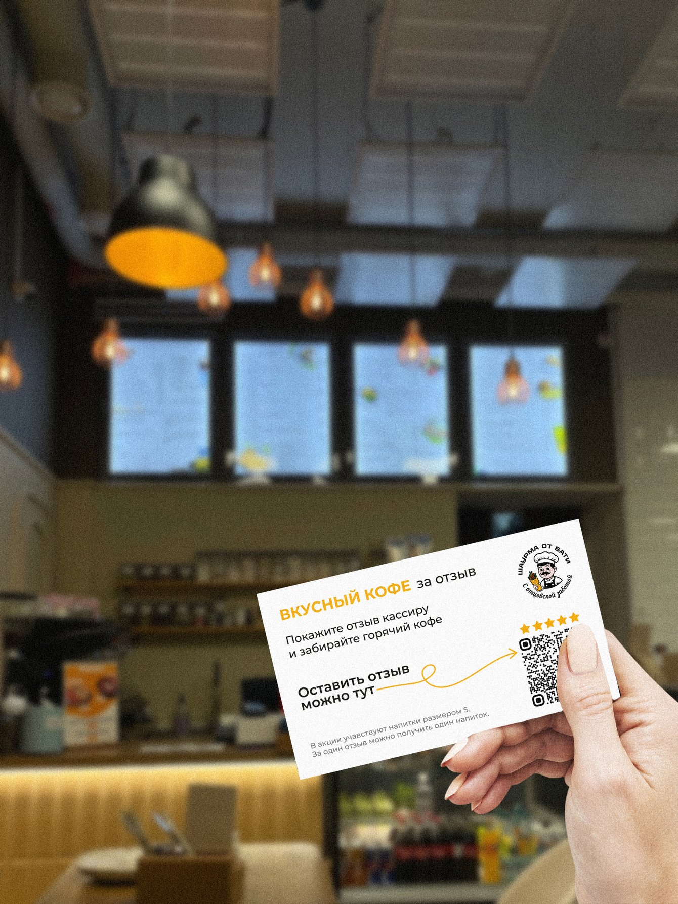 визитки, карту постоянного клиента, скидочные карты для акции), а так же упаковку и фирменный мерч (пакет, фирменные пластиковые и бумажные стаканчики, миски, фирменную футболку и бейсболку).