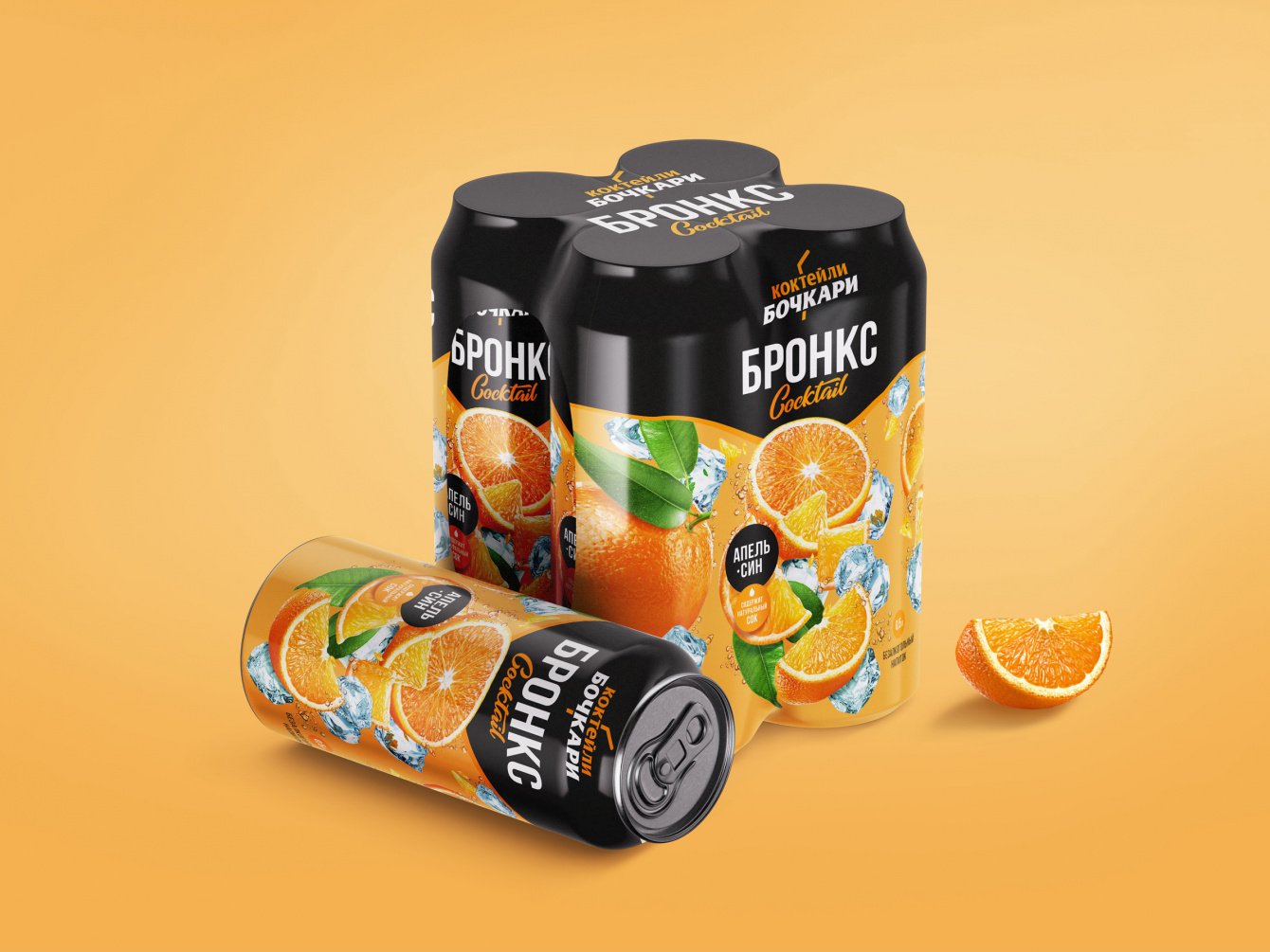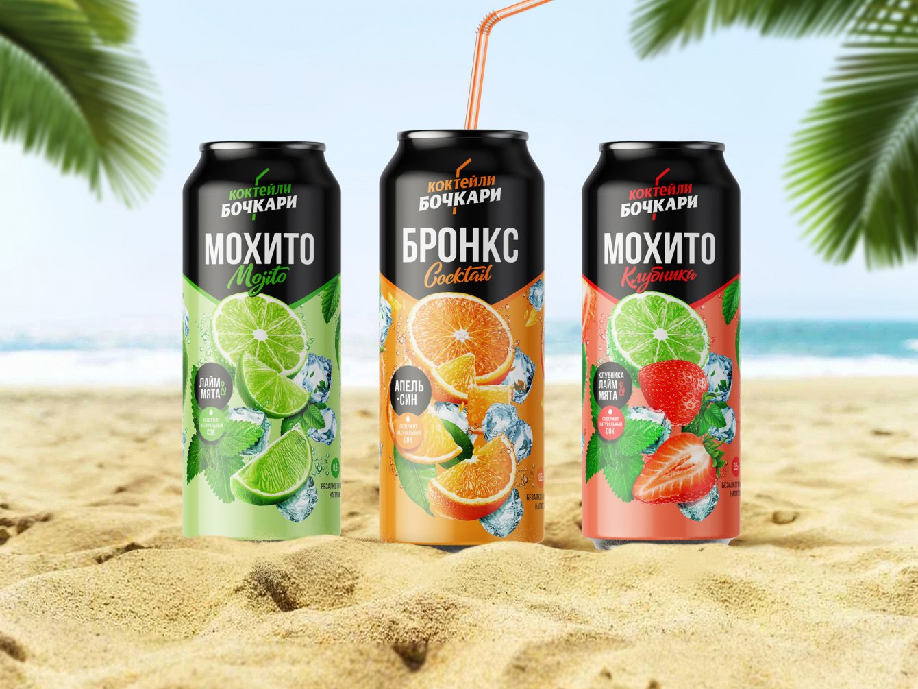 Заказчику требовалось осуществить несколько задач: вывести "no name" коктейли в общую коктейльную серию, под торговой маркой "Коктейли Бочкари"; создать сочные фотореалистичные иллюстрации; разработать дизайн серии для алюминиевой банки и пэт-бутылки.