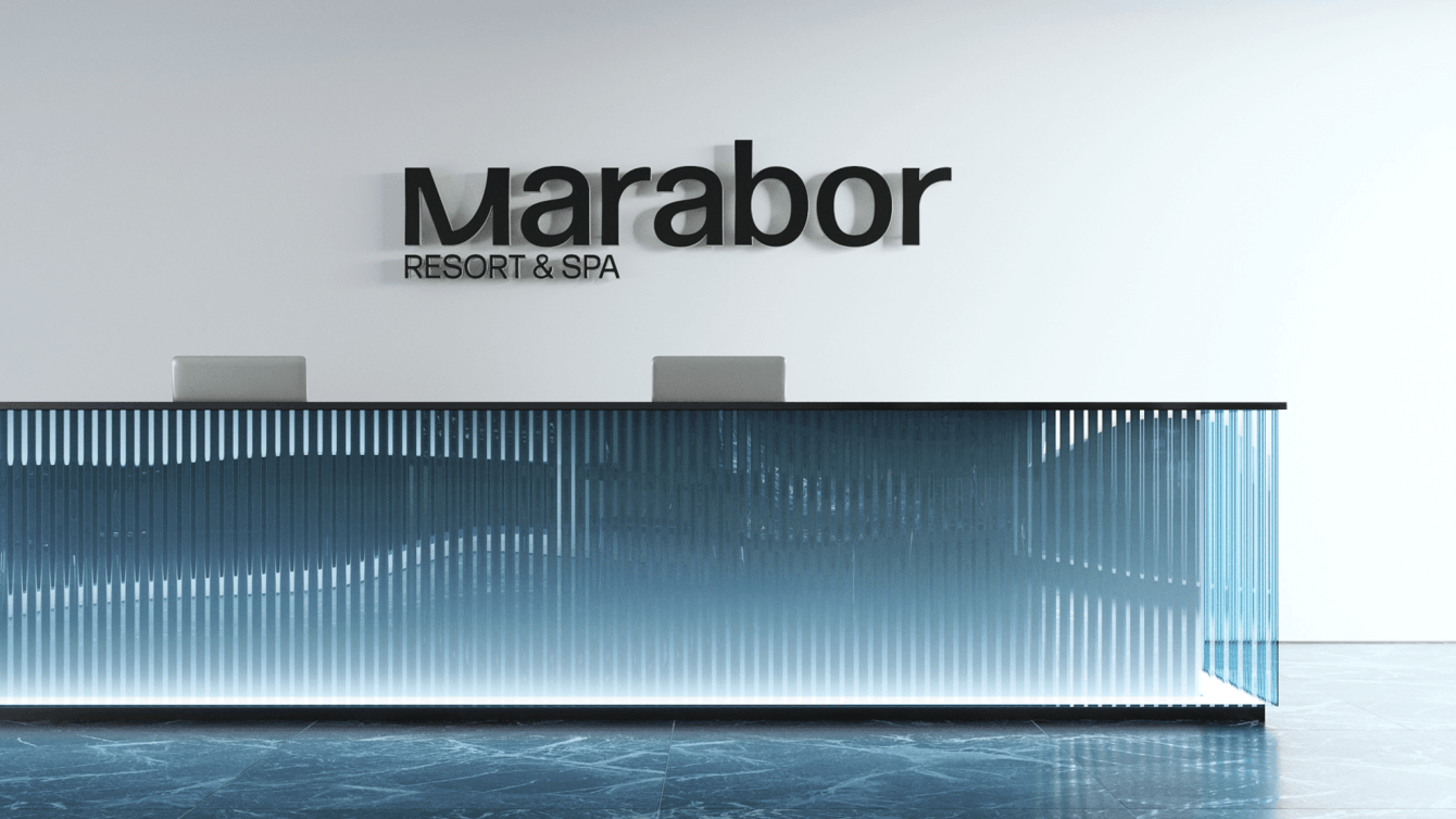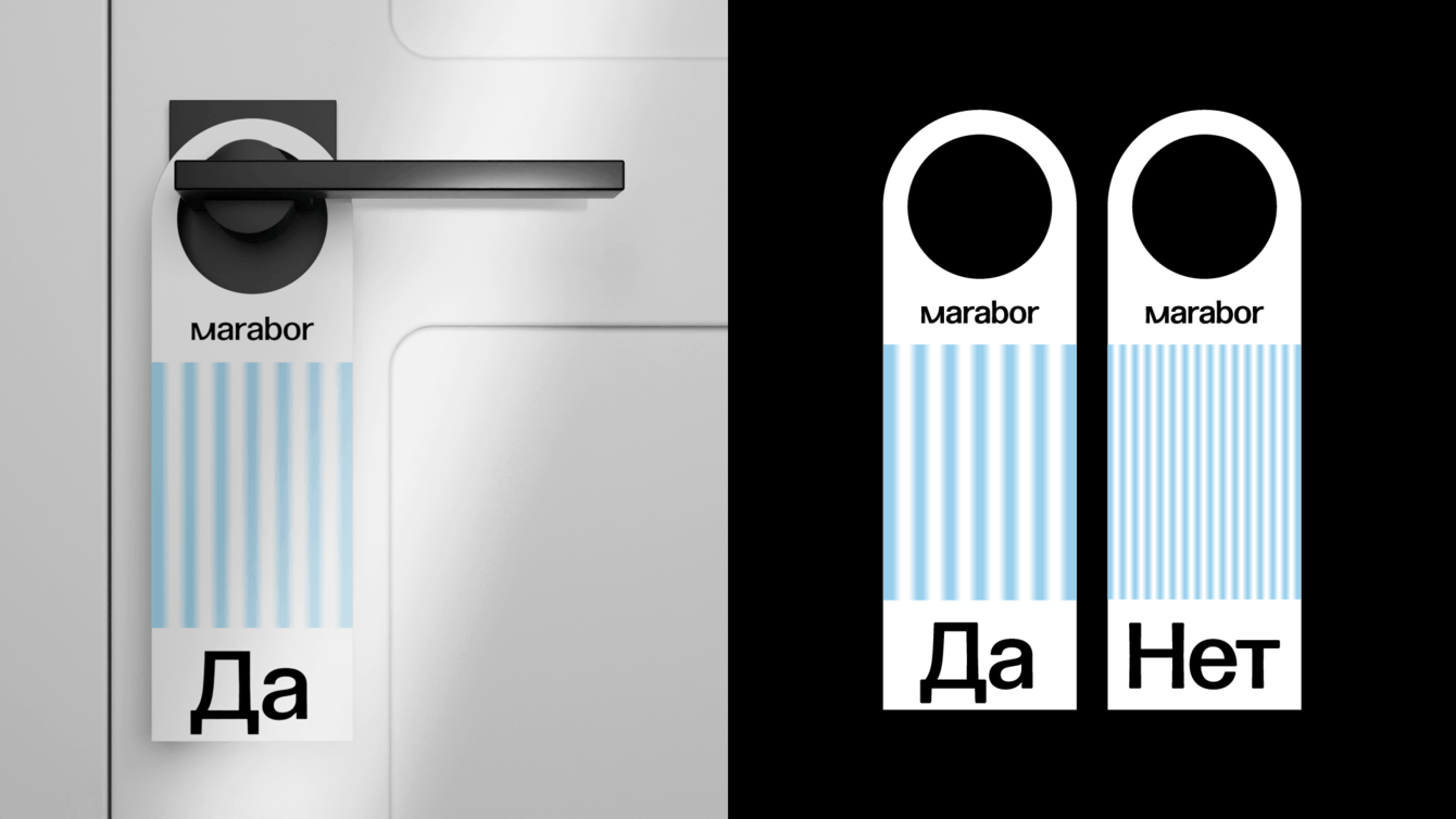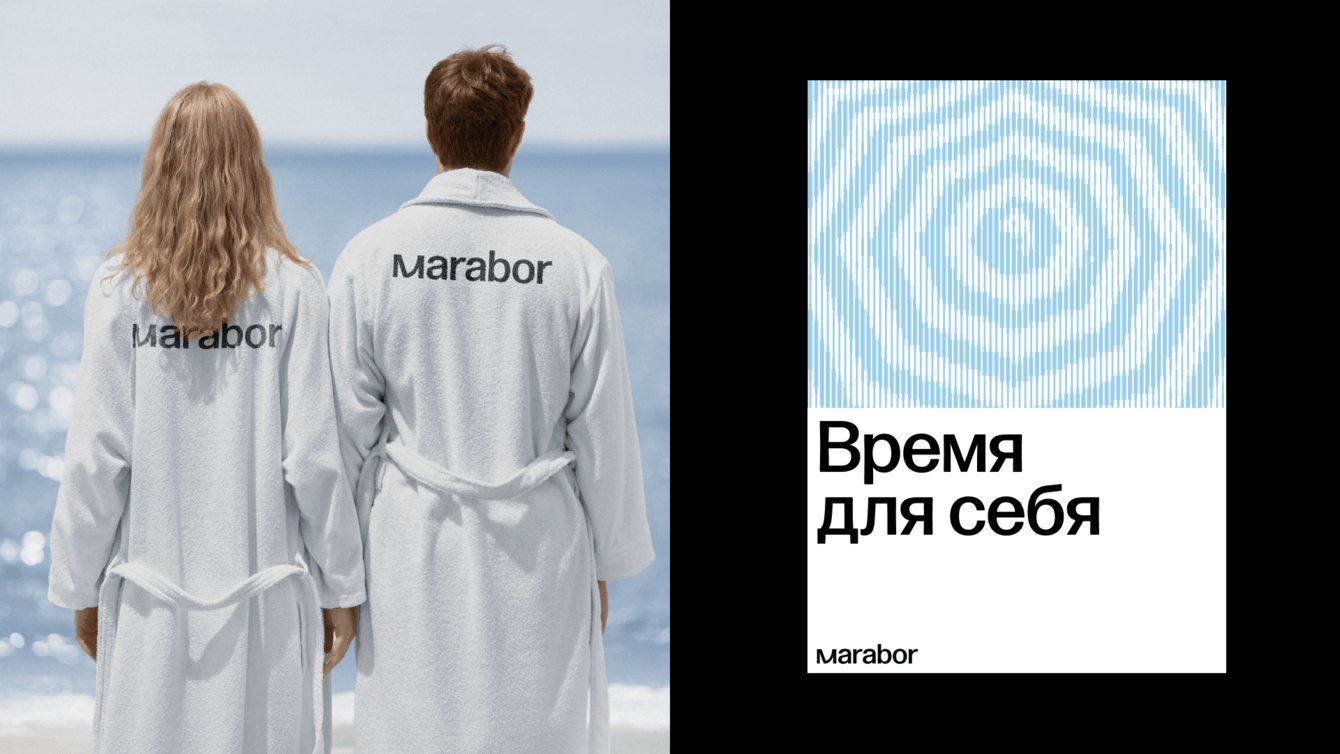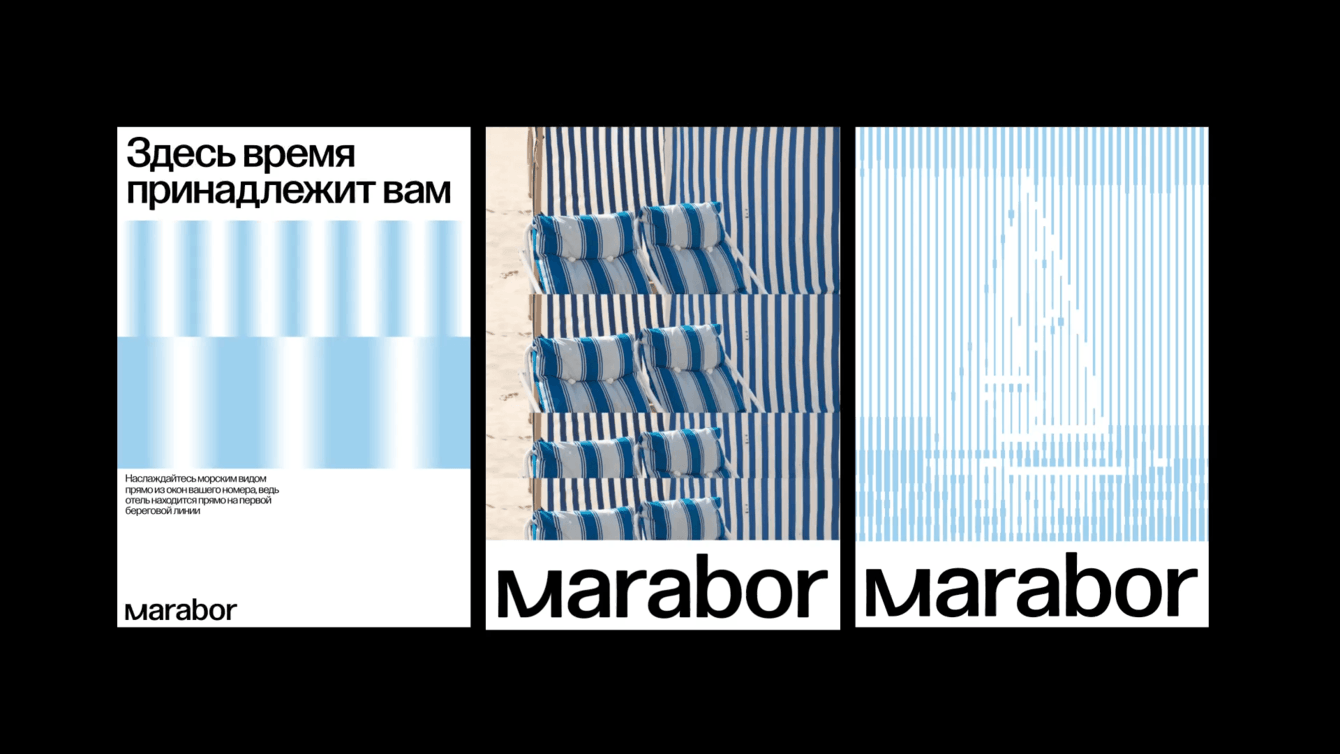 Визуальная система строится на повторяющемся ритме волн и настраивает на замедление и расслабление. В букве М одна диагональ стала плавной линией — она повторяет архитектурную форму здания, вид сверху. Отель Marabor — пятое измерение, место, где время течет размеренно. Где мы можем перезарядиться и свежим взглядом смотреть на привычные вещи.