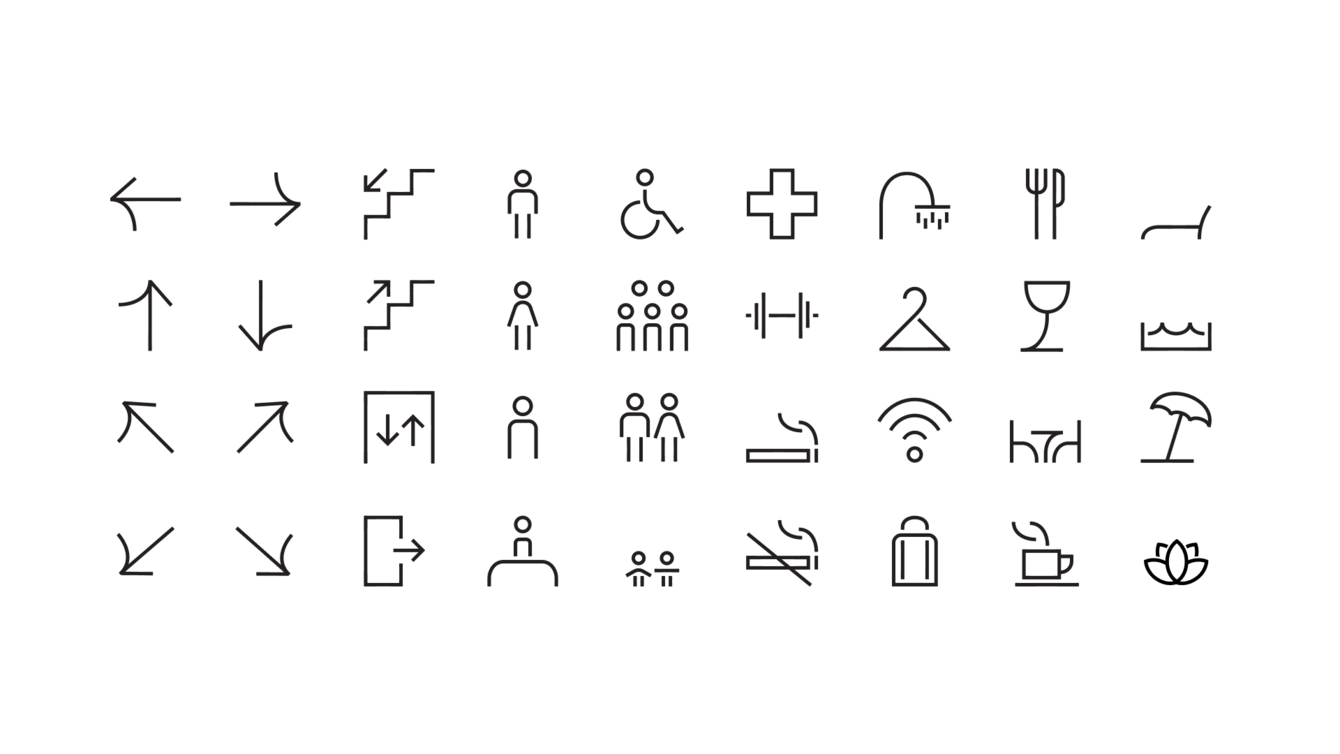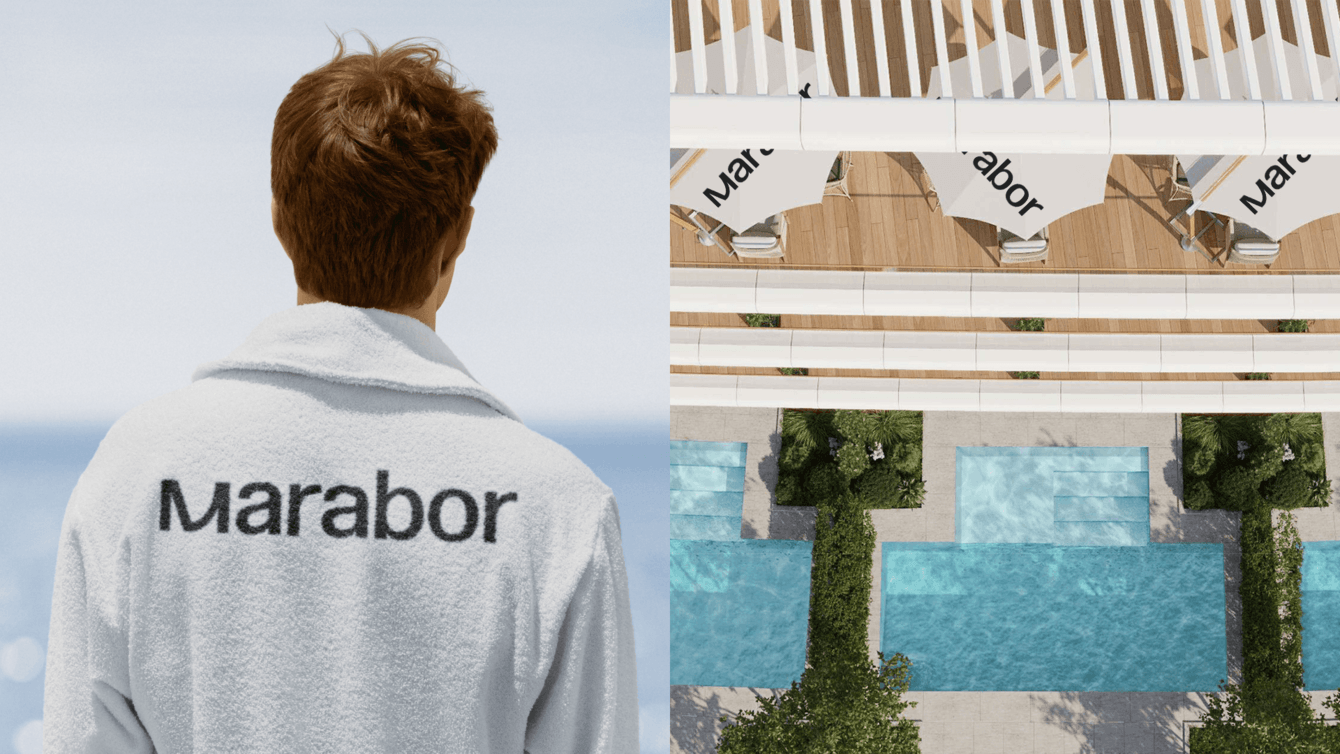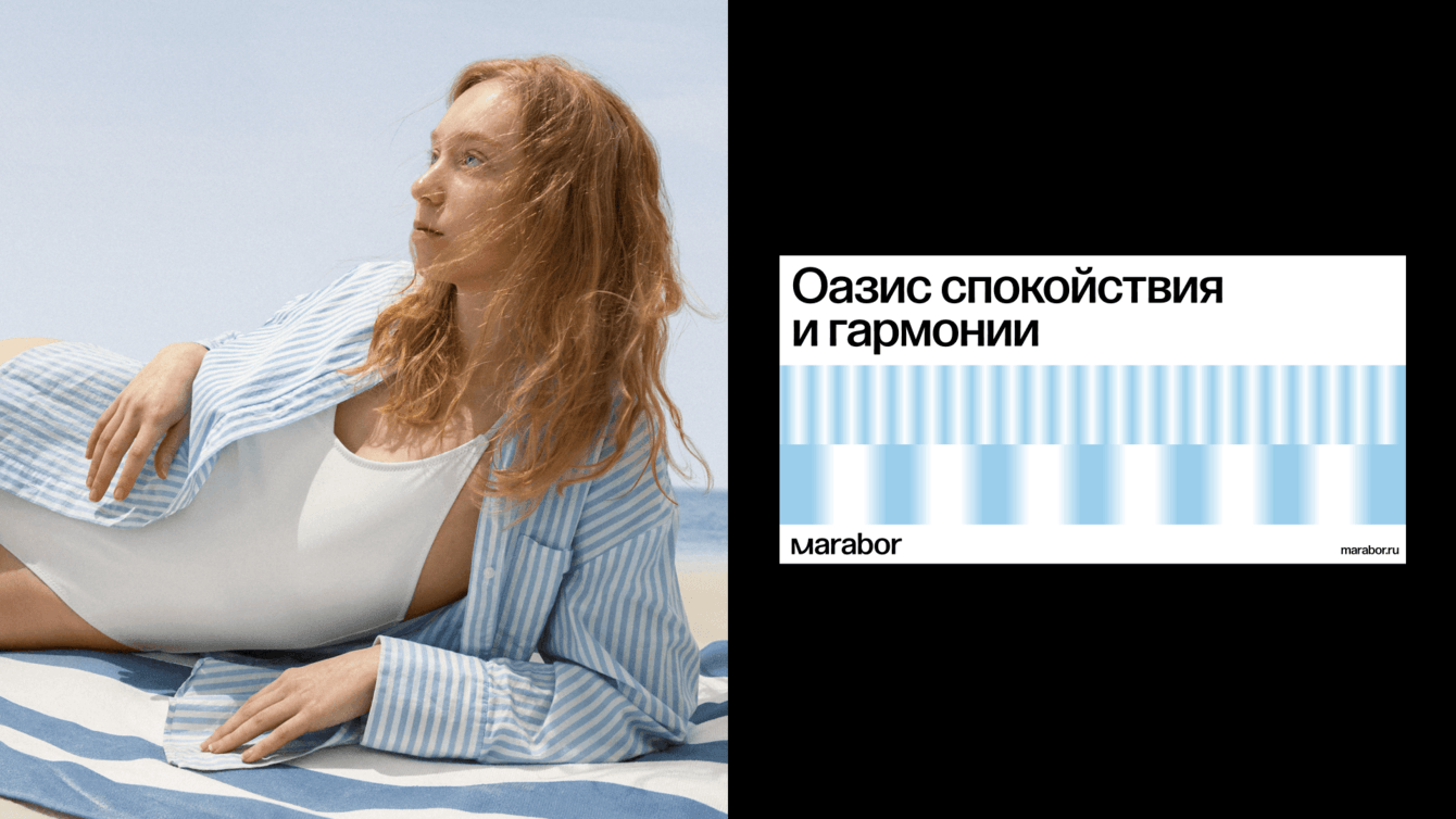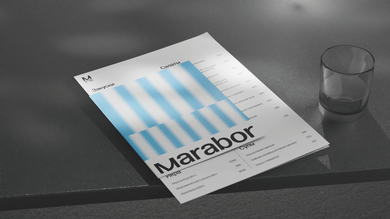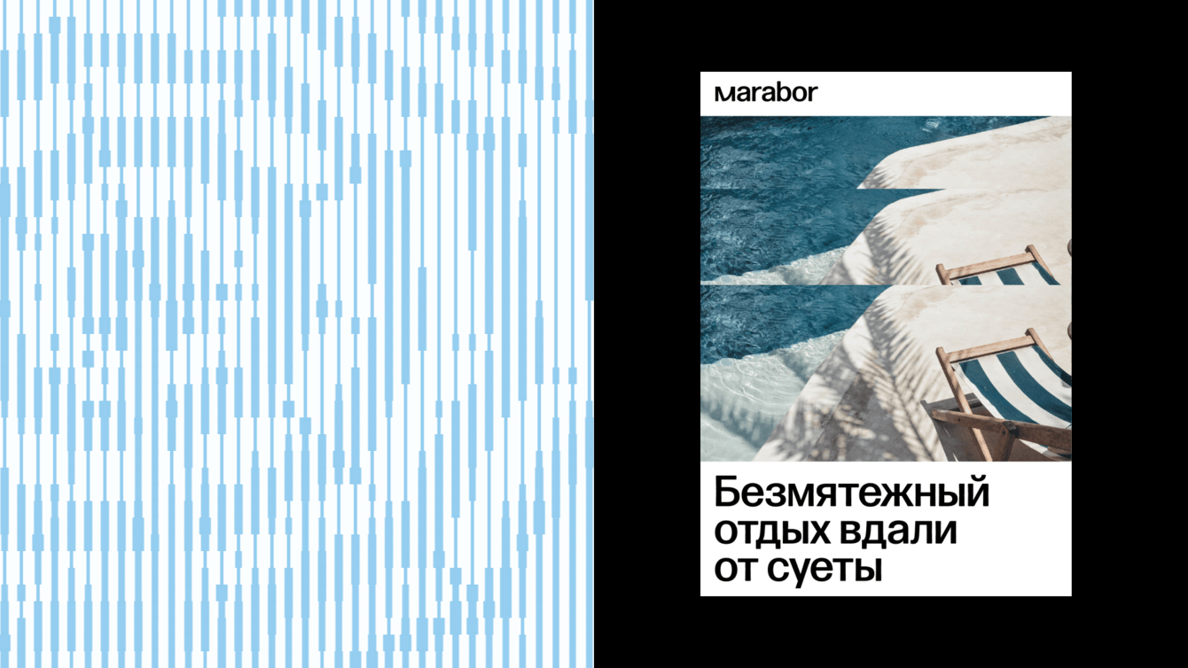 Визуальная система строится на повторяющемся ритме волн и настраивает на замедление и расслабление. В букве М одна диагональ стала плавной линией — она повторяет архитектурную форму здания, вид сверху. Отель Marabor — пятое измерение, место, где время течет размеренно. Где мы можем перезарядиться и свежим взглядом смотреть на привычные вещи.