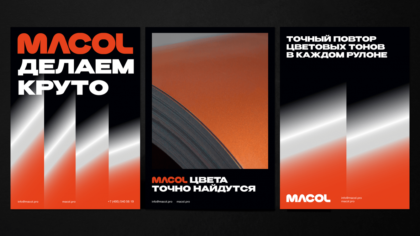 Позиционирование MACOL — покрасчик первоклассной рулонной стали с персональным подходом к подбору цветов и покрытий. И новый визуальный образ полностью соответствует амбициозным задачам этой уникальной компании. Мы продолжаем сотрудничество и сейчас разрабатываем корпоративный сайт MACOL.