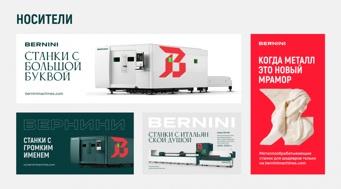 Основой для брендинга стал итальянский нейминг, предложенный заказчиком. Бернини — итальянская фамилия. У станков компании — итальянская душа. Этот тезис и стал основой будущего брендинга.