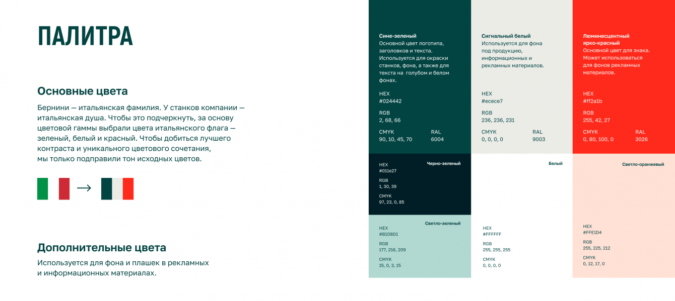 Бернини — итальянская фамилия. У станков компании — итальянская душа. Чтобы это подчеркнуть, за основу цветовой гаммы выбрали цвета итальянского флага — зеленый, белый и красный. Чтобы добиться лучшего контраста и уникального цветового сочетания, мы только поправили тон исходных цветов.