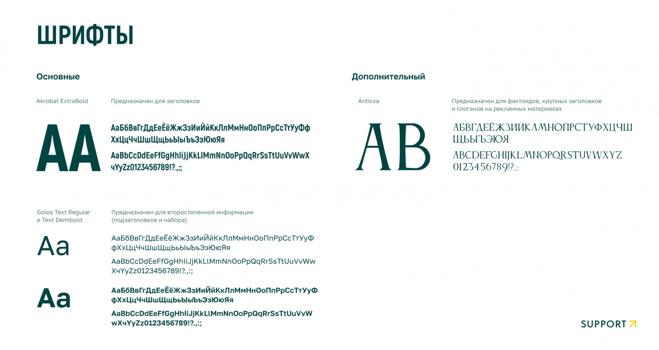 Дополнительный шрифт — Anticva антиква, напоминающая шрифты с засечками 17 века. Шрифт предназначен для композиционных и эмоциональных акцентов на рекламных материалах — слоганы, цифры, значения.