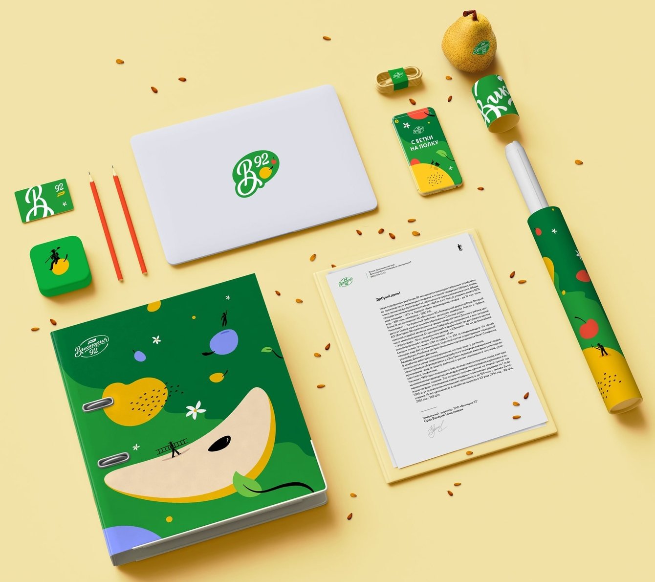 При масштабировании стиля мы учитывали, что стиль должен работать как минималистичном исполнении, где мало места под дизайн, так и в более насыщенном деталями варианте. Так на деловой документации было решено отказаться от декоративных деталей, а на промо-носителях мы полностью покрывали поверхность фирменным элементом с маленькими садоводами.