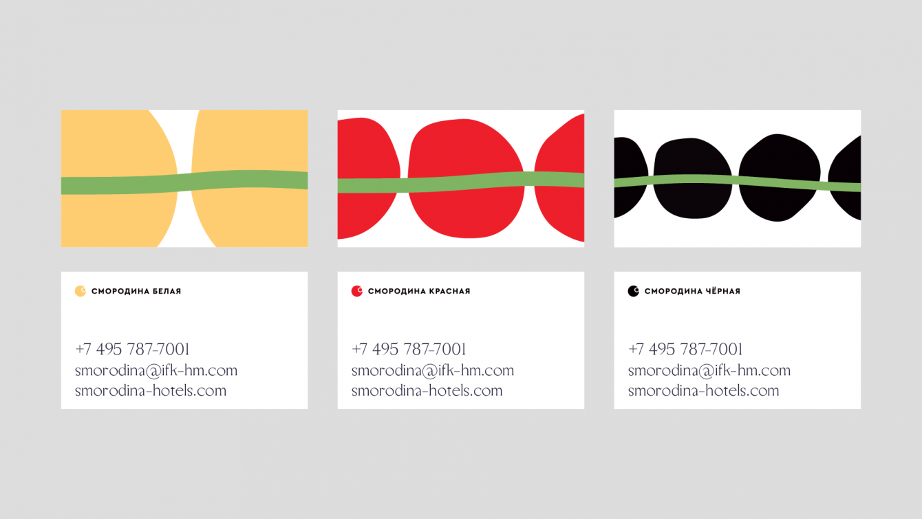 Фирменный стиль — наше переосмысление традиционных русских образов. В сеть входят отели трех категорий — от 2, 3 и 4 звезды. Белая, красная и черная «Смородина». Они стали основой для идентификации бренда. Мы постарались передать ощущение тепла и душевной заботы с помощью чуть наивных и трогательных иллюстраций, а также энергичной и яркой цветовой гаммы. В системе навигации и пиктограммах скрыты «хвостики» веточки смородины — всё построено на этих элементах. Открытый, дружелюбный и непосредственный — это выражение характера «Смородины».