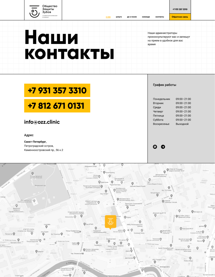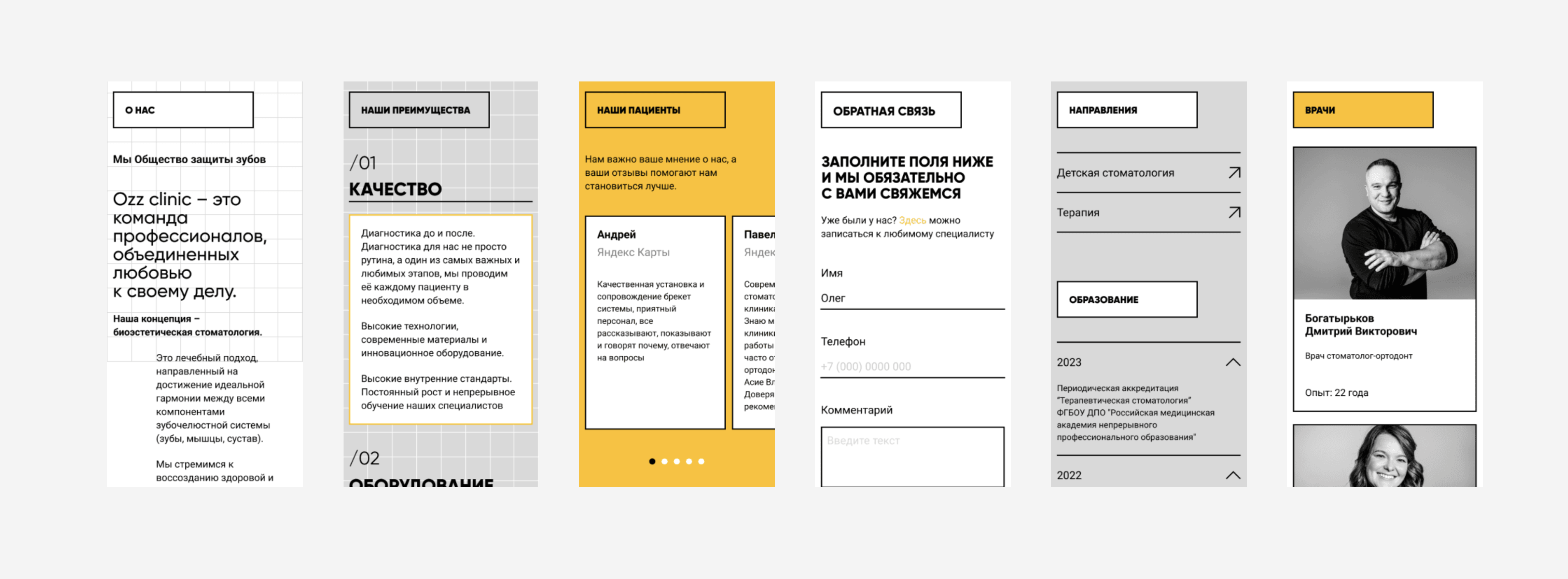 В результате нашей работы были созданы материалы как для внутреннего, так и для внешнего использования. Наиболее трудоемким и значимым из них, безусловно, является сайт клиники. Он сохранил ключевые стилистические принципы бренда, воплощенные в нестандартной сетке, выразительной типографике и эмоциональных фотографиях врачей и пациентов.