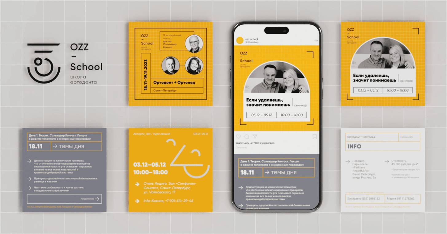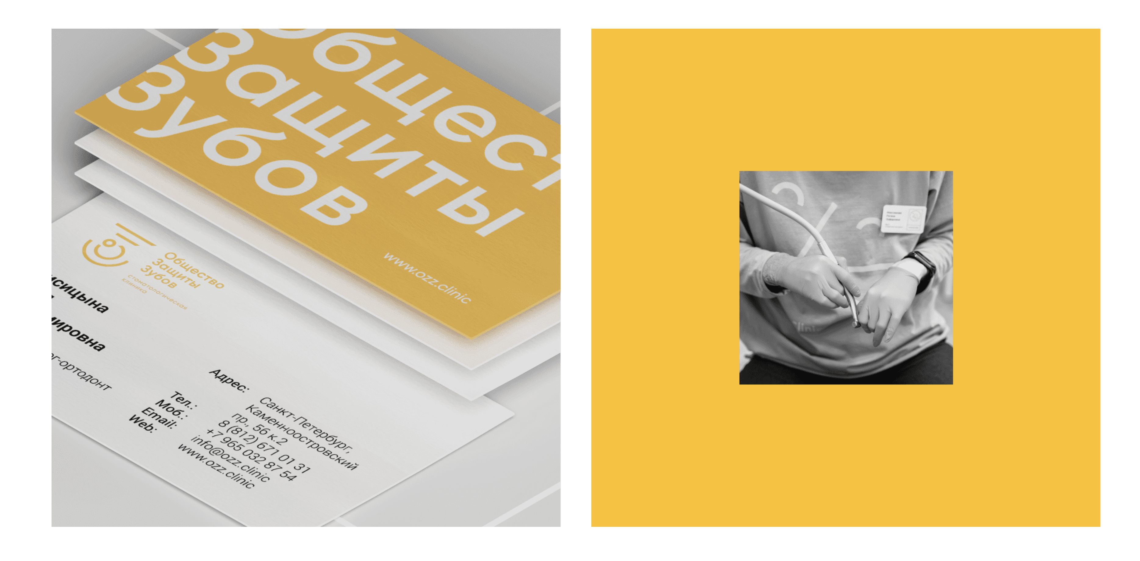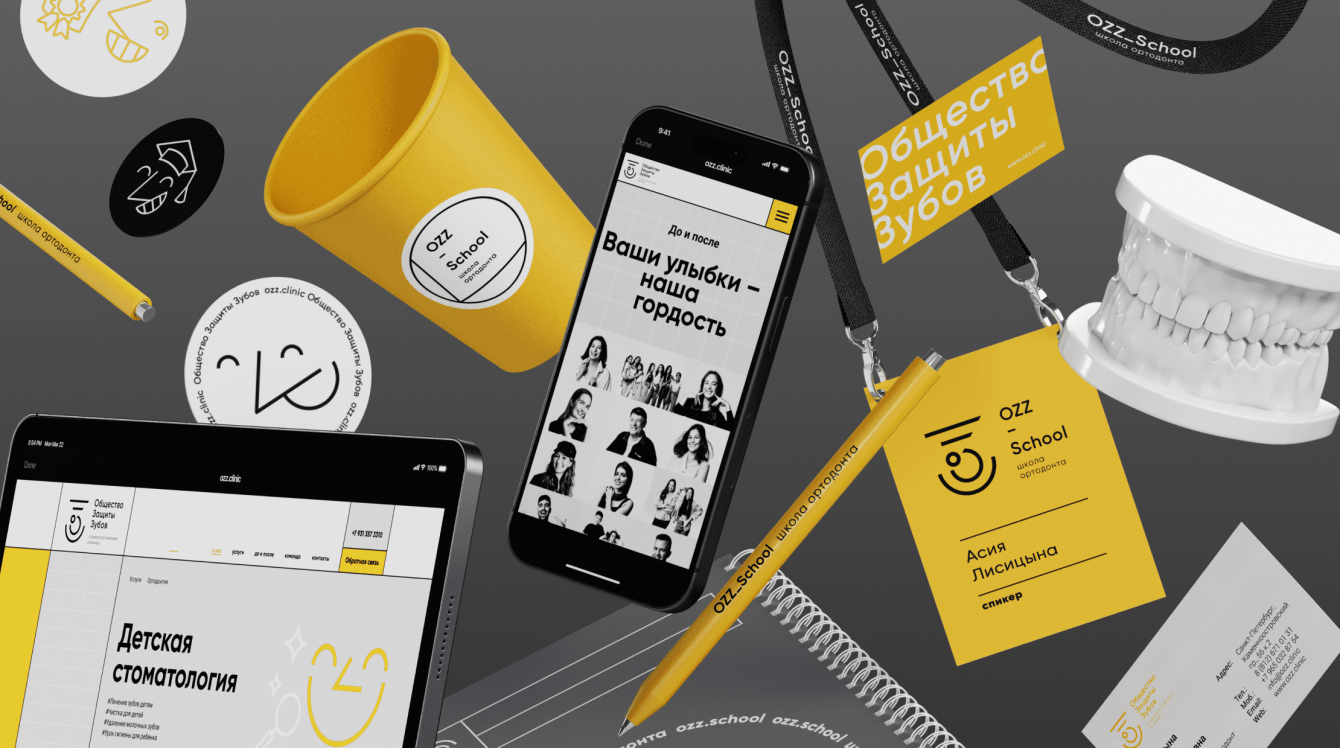 Визуальная концепция клиники получила развитие в печатной продукции бренда, навигационной и информационной системах, web-сайте, а так же в реализации субренда клиники – школе ортодонта OZZ School. Ключевыми носителями которой стали посты в социальных сетях, раздаточные и сопроводительные материалы, элементы сувенирной продукции (мерч)